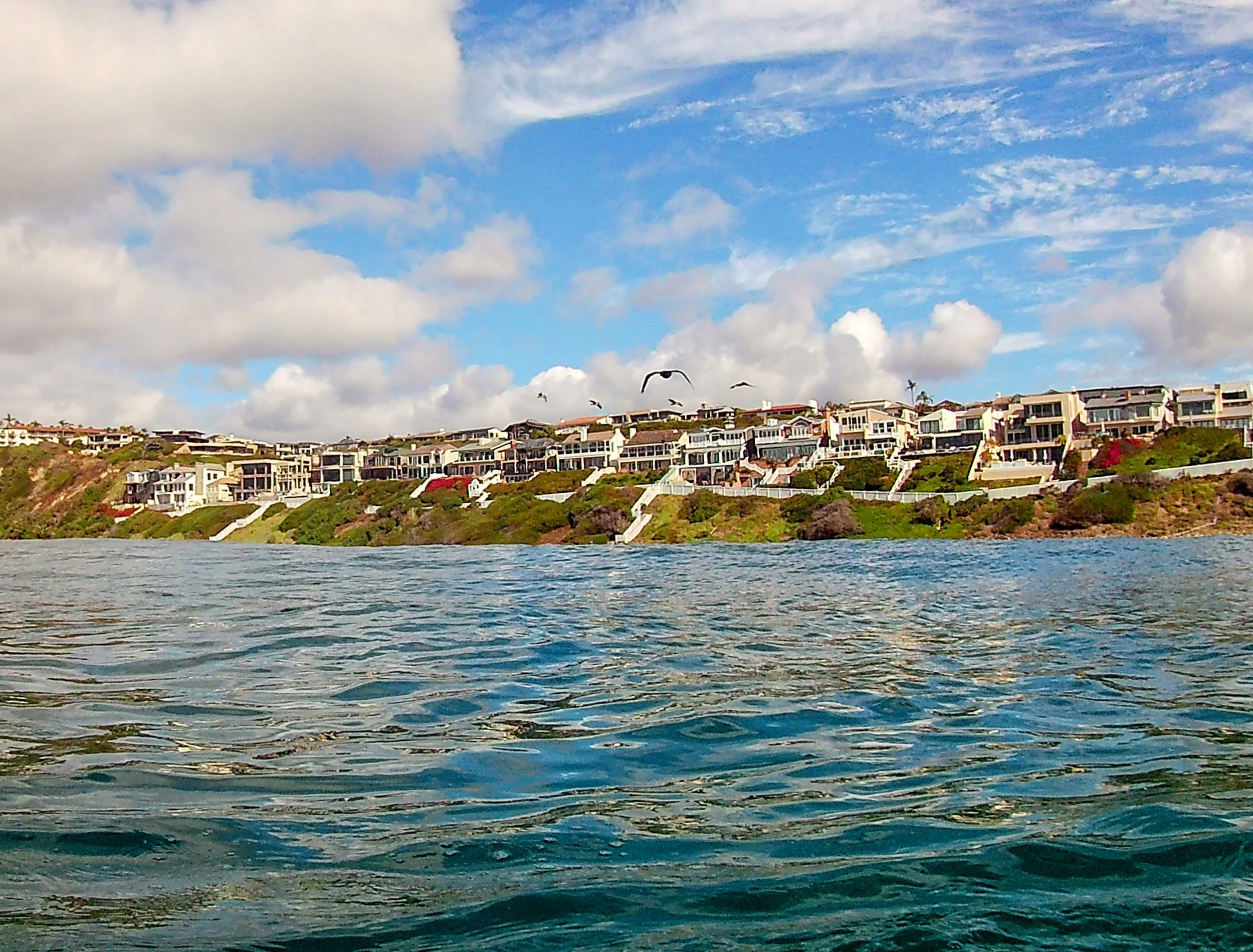 Further off in the distance past the point I can see waves breaking on the rocks. Then I turn to look north towards Monarch and I see a gathering of clouds just above the Ritz Carlton that casts a shadow over the bathrooms on the beach.