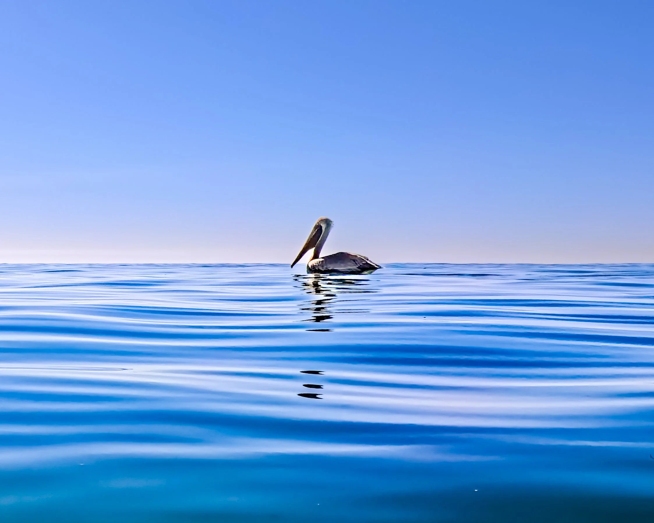 The storm in my head feels far away. It feels not quite real. The intensity of the nature that surrounds me drowns out the tempest and before I know it I have swam all the way to the Monarch Bay Beach club and back to my entry spot here just in front of the Niguel Shores homes. I swim in a line towards the ramp that leads to the stairs and just before I end the swim, I see a pelican sitting close by on the water. This is a small (or maybe not so small) miracle happening right here in front of me.