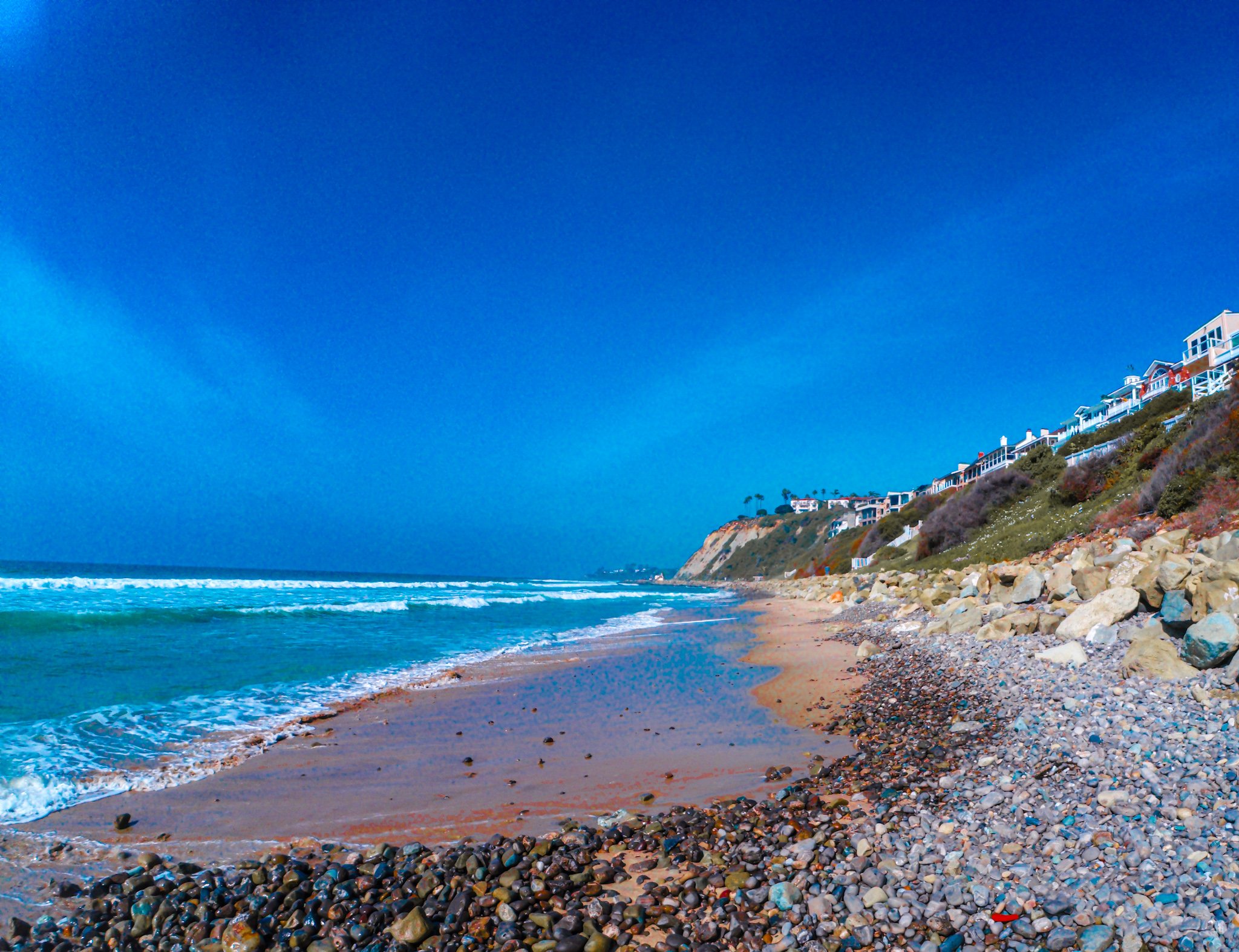 Sure enough, before long I have passed several houses and it looks as though it is inevitable that I will not be in need of rescue or at least I won’t need to end the swim somewhere in Salt Creek or San Pedro. I’m getting closer and closer to the breaking waves and once I decide to head directly to shore, it looks as though I have over shot my destination and I aim northward again.