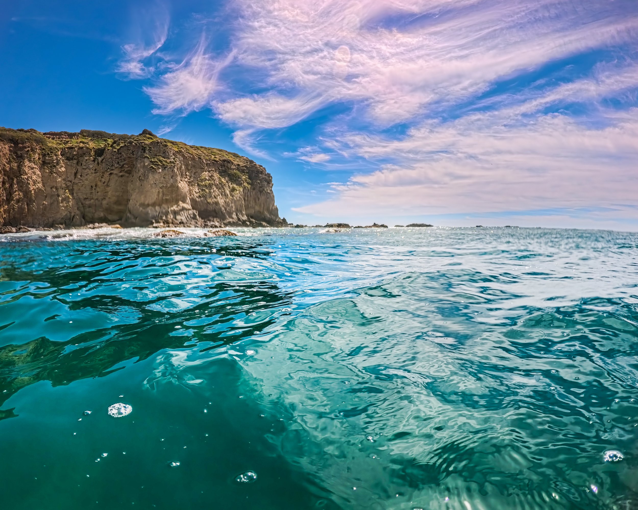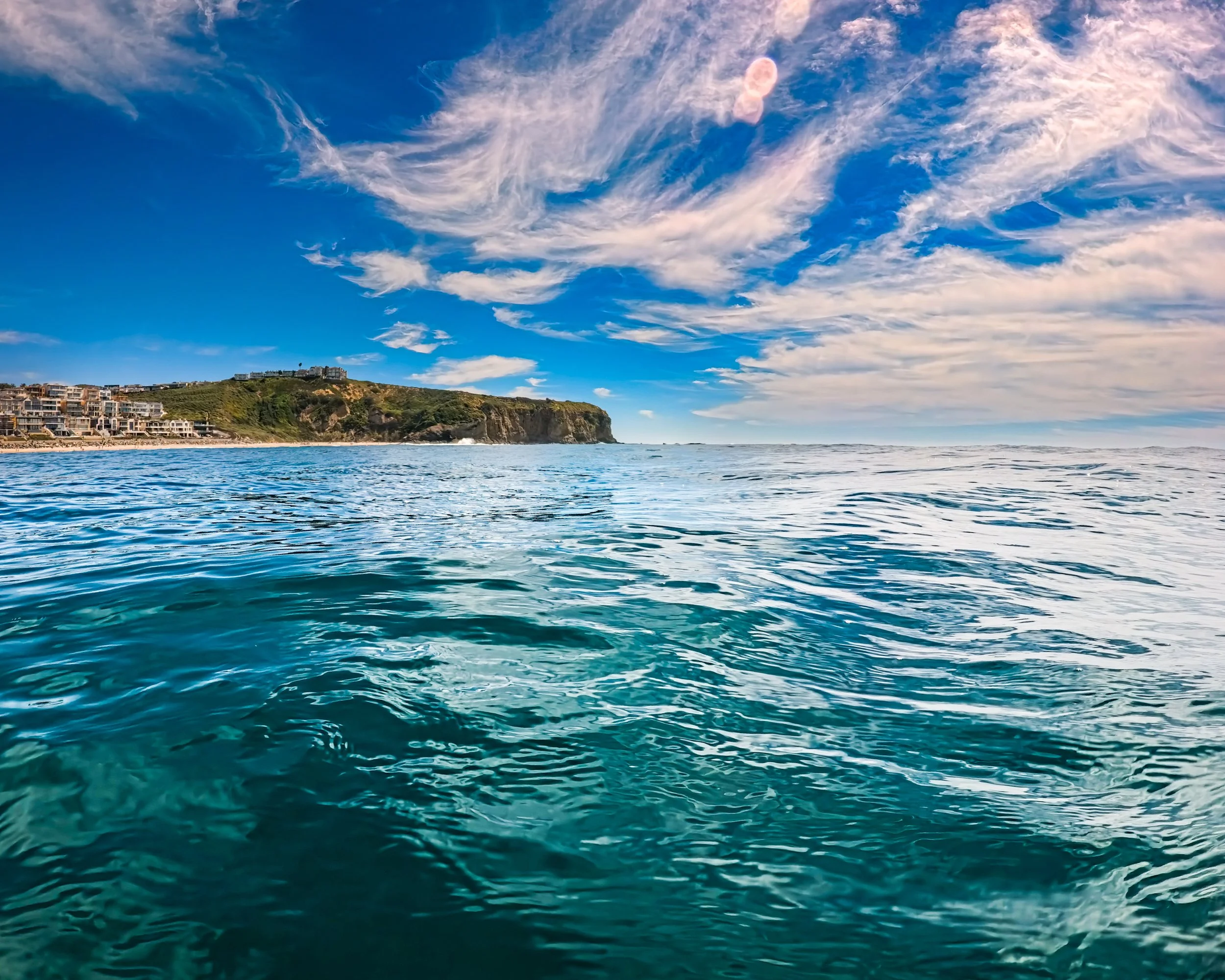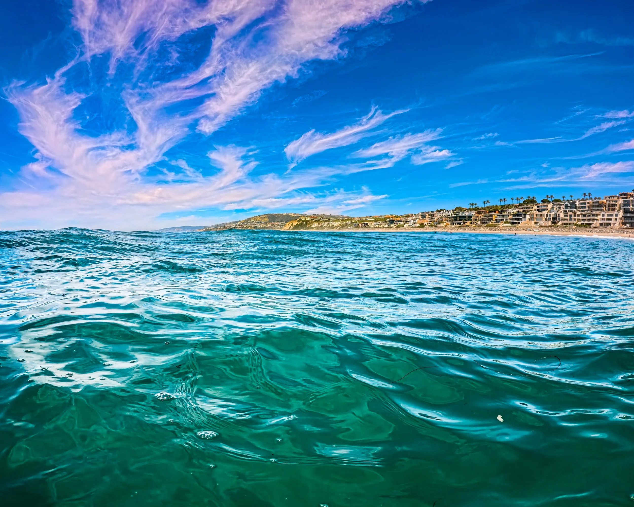 I swim further from shore than I have on recent swims. The waves have been so calm lately but today is much bigger. Sometimes when the water is calm as a lake, it is hard to imagine that it could ever be as rough as it is today. However, out here past the surf, it remains calm. I do feel sort of a stir beneath the surface that I would not otherwise feel but the ocean surface looks smooth and these wispy “clouds” give it a sort of glow that makes it all look alive. It’s beautiful out here.