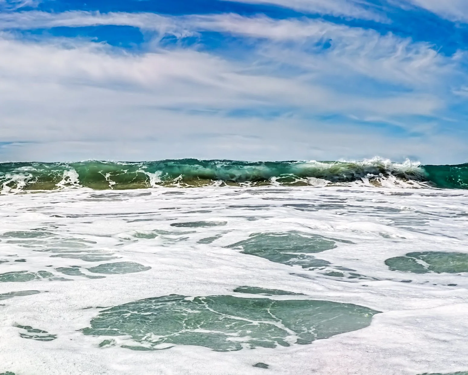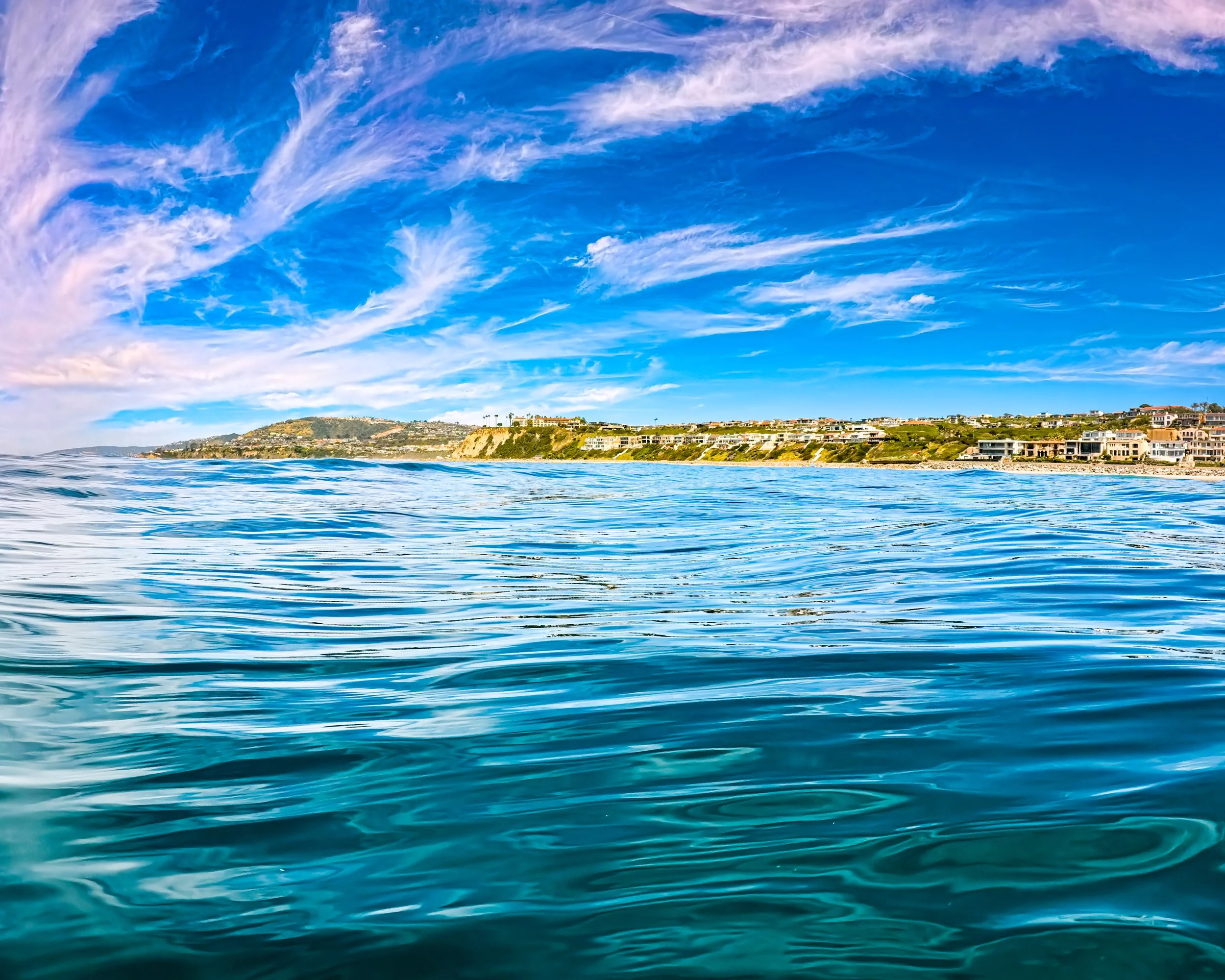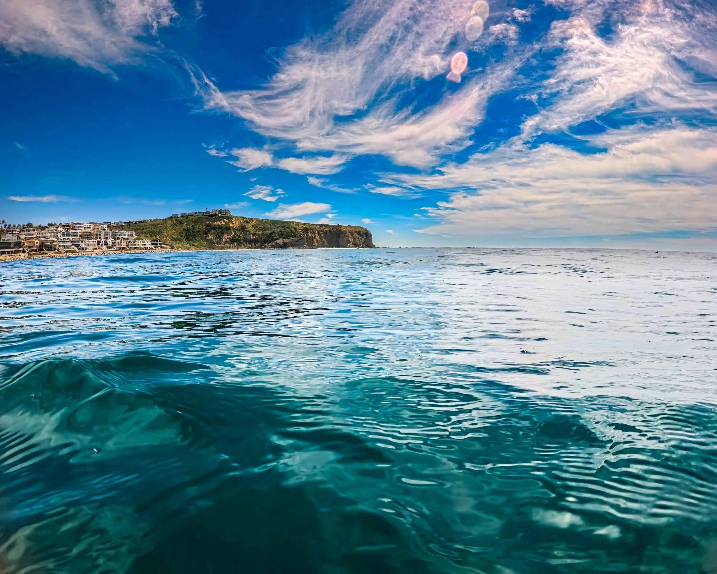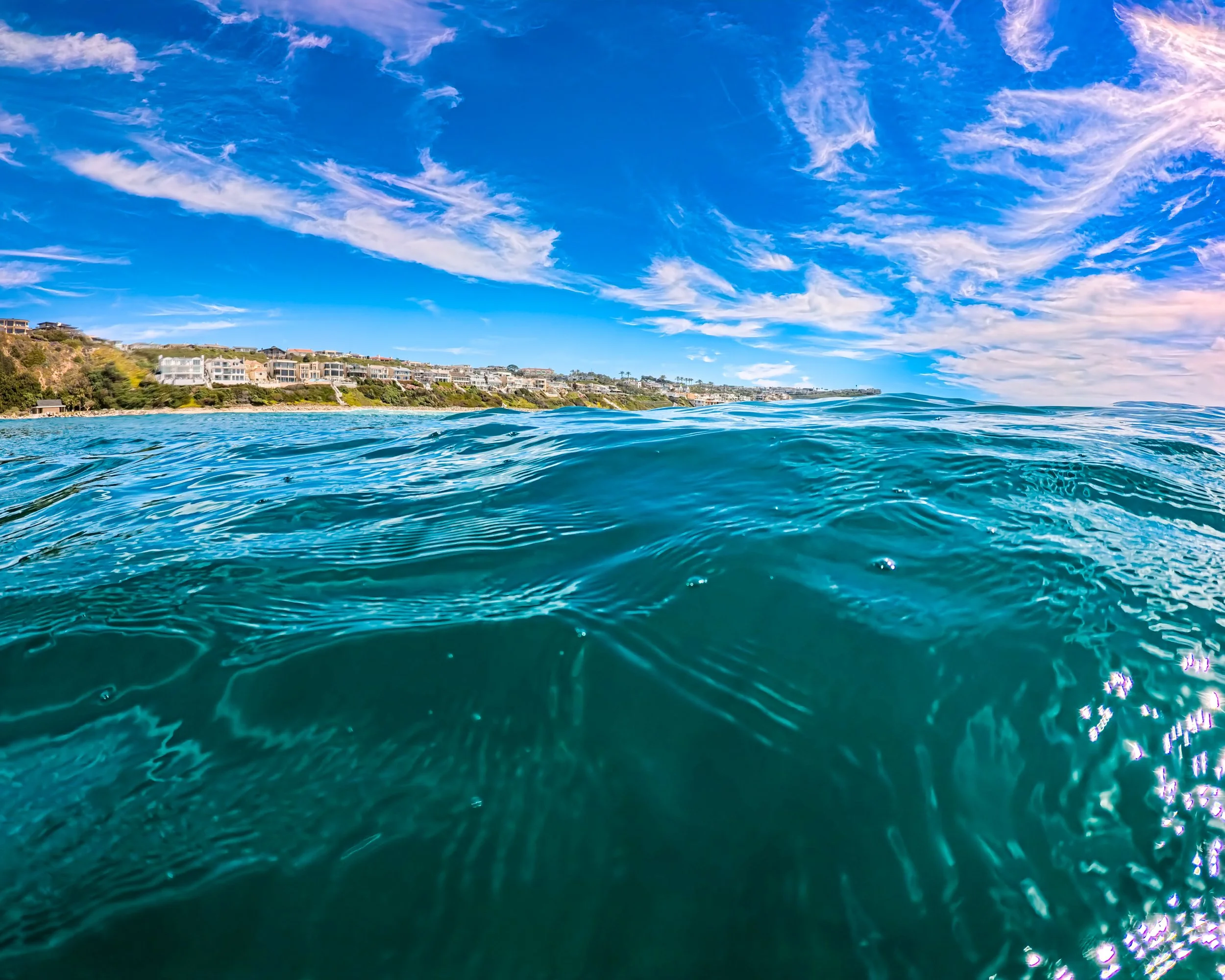 I swim further from shore than I have on recent swims. The waves have been so calm lately but today is much bigger. Sometimes when the water is calm as a lake, it is hard to imagine that it could ever be as rough as it is today. However, out here past the surf, it remains calm. I do feel sort of a stir beneath the surface that I would not otherwise feel but the ocean surface looks smooth and these wispy “clouds” give it a sort of glow that makes it all look alive. It’s beautiful out here.