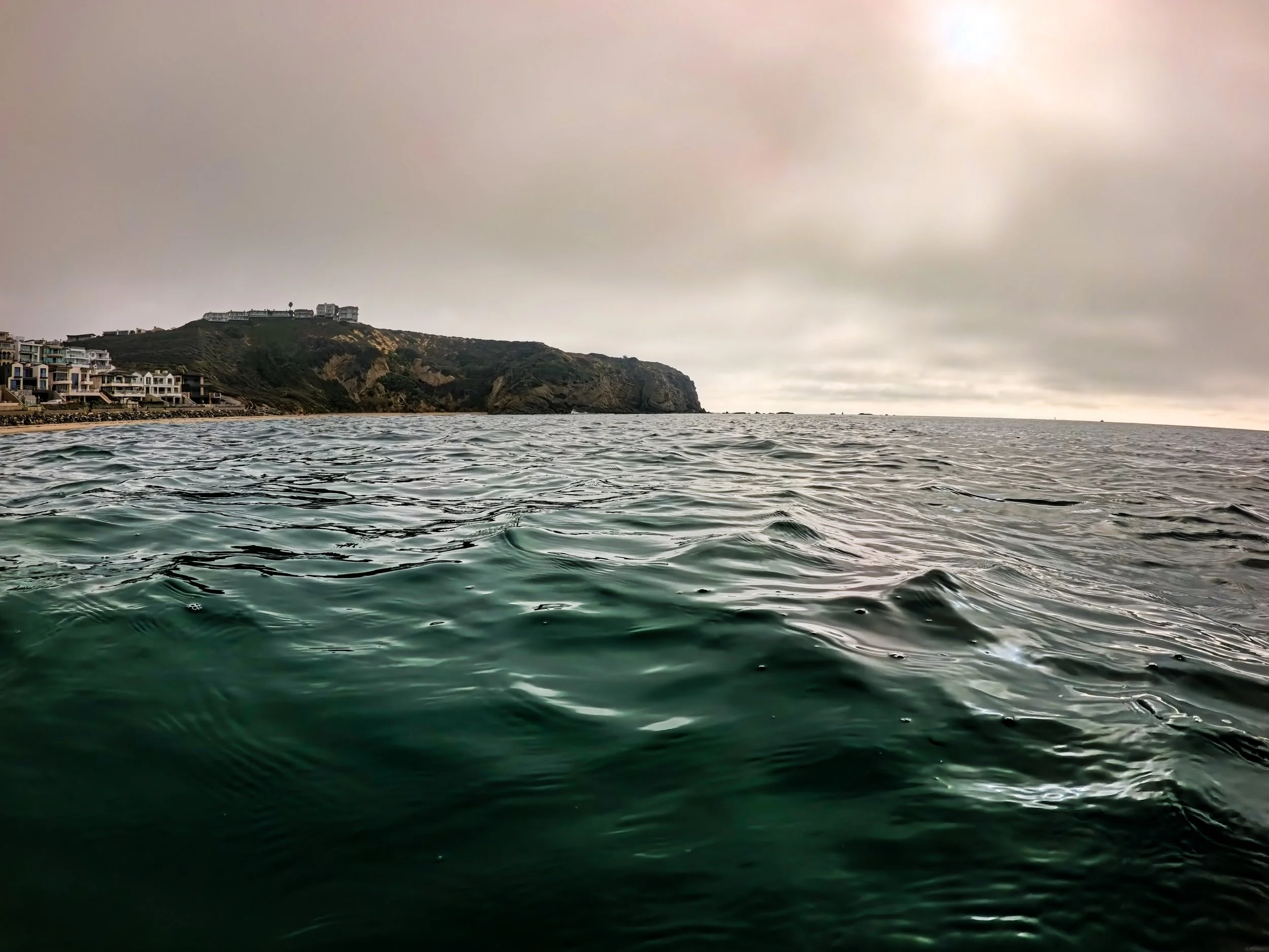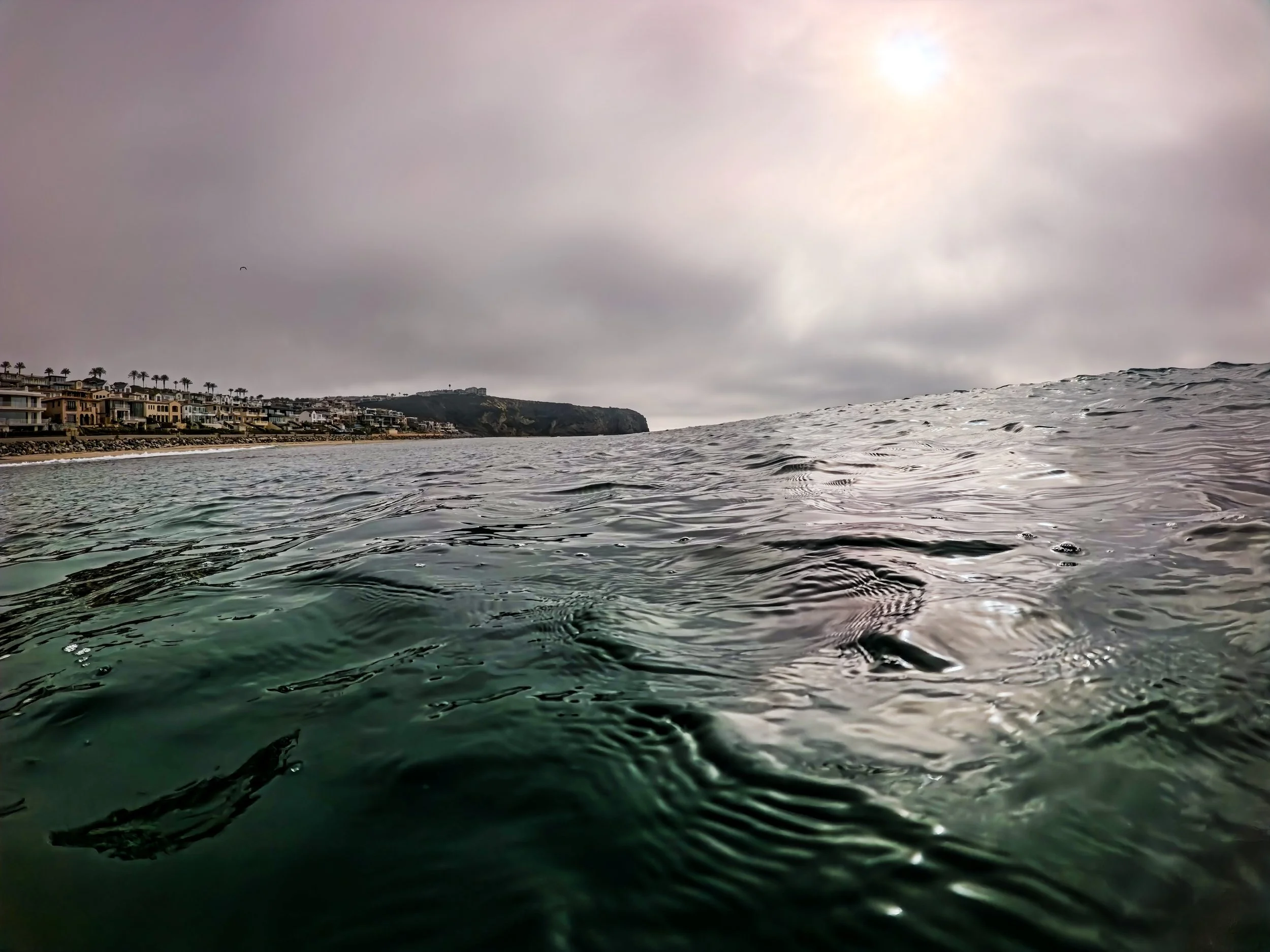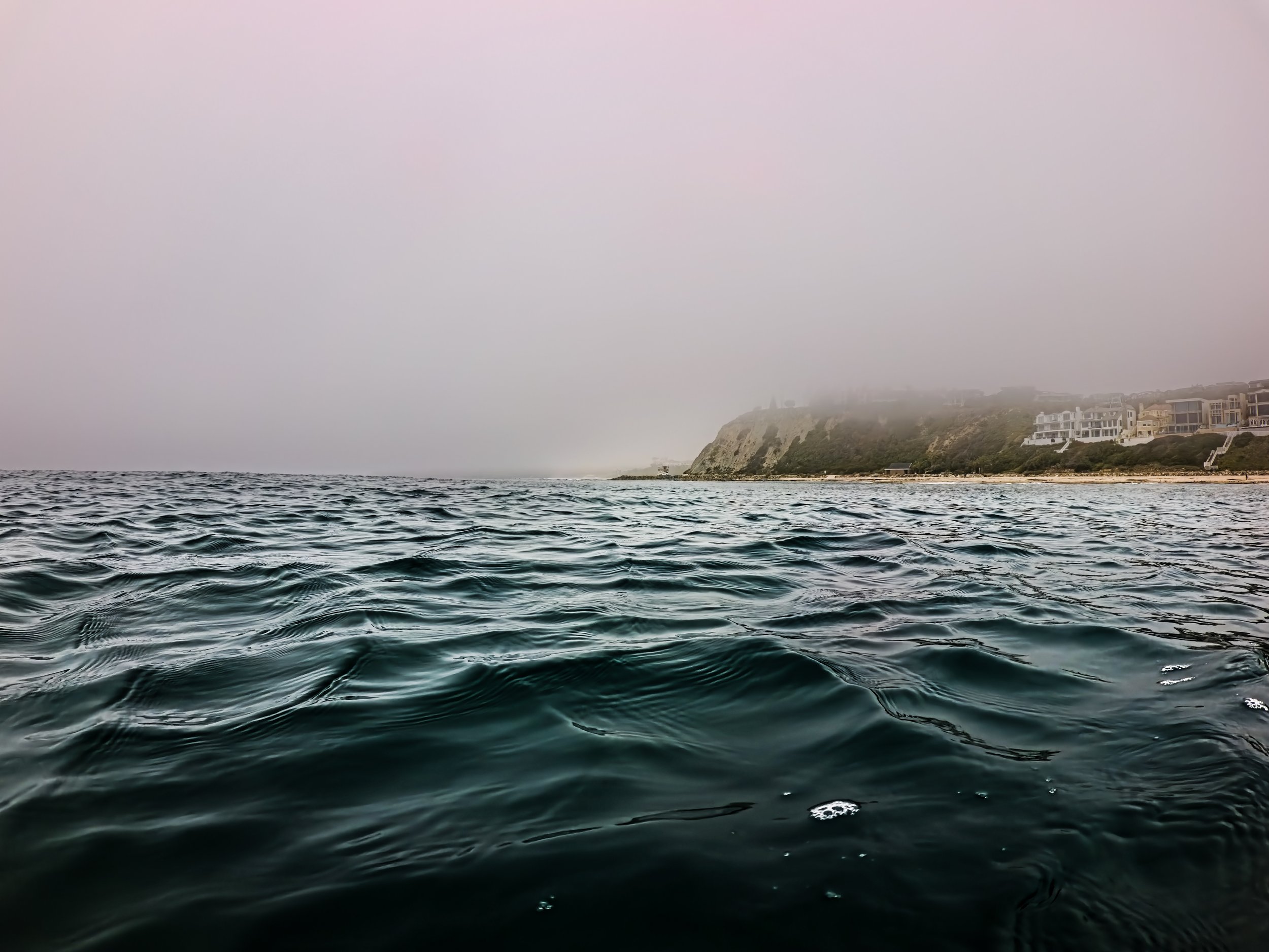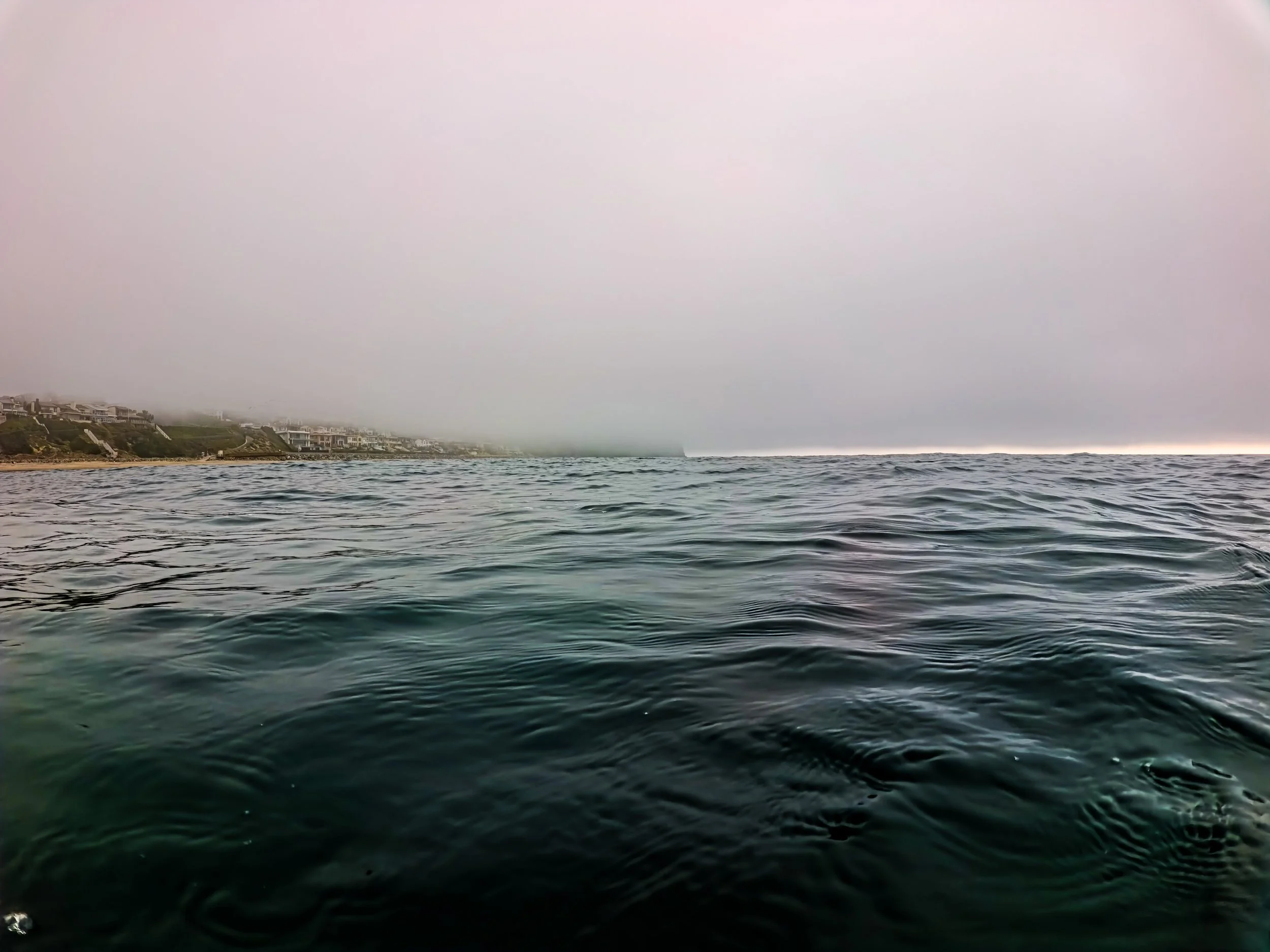 Meanwhile above the surface, things are growing more and more dim. I have to stop a few times to get my bearings because I am having difficulty seeing where I am in relation to land. It is not so socked in that I can’t see the beach but it is extremely fogged in and I can’t see the headlands anymore and the lifeguard tower up at Salt Creek looks very fuzzy. I wipe out my goggles which improves things but not by much.