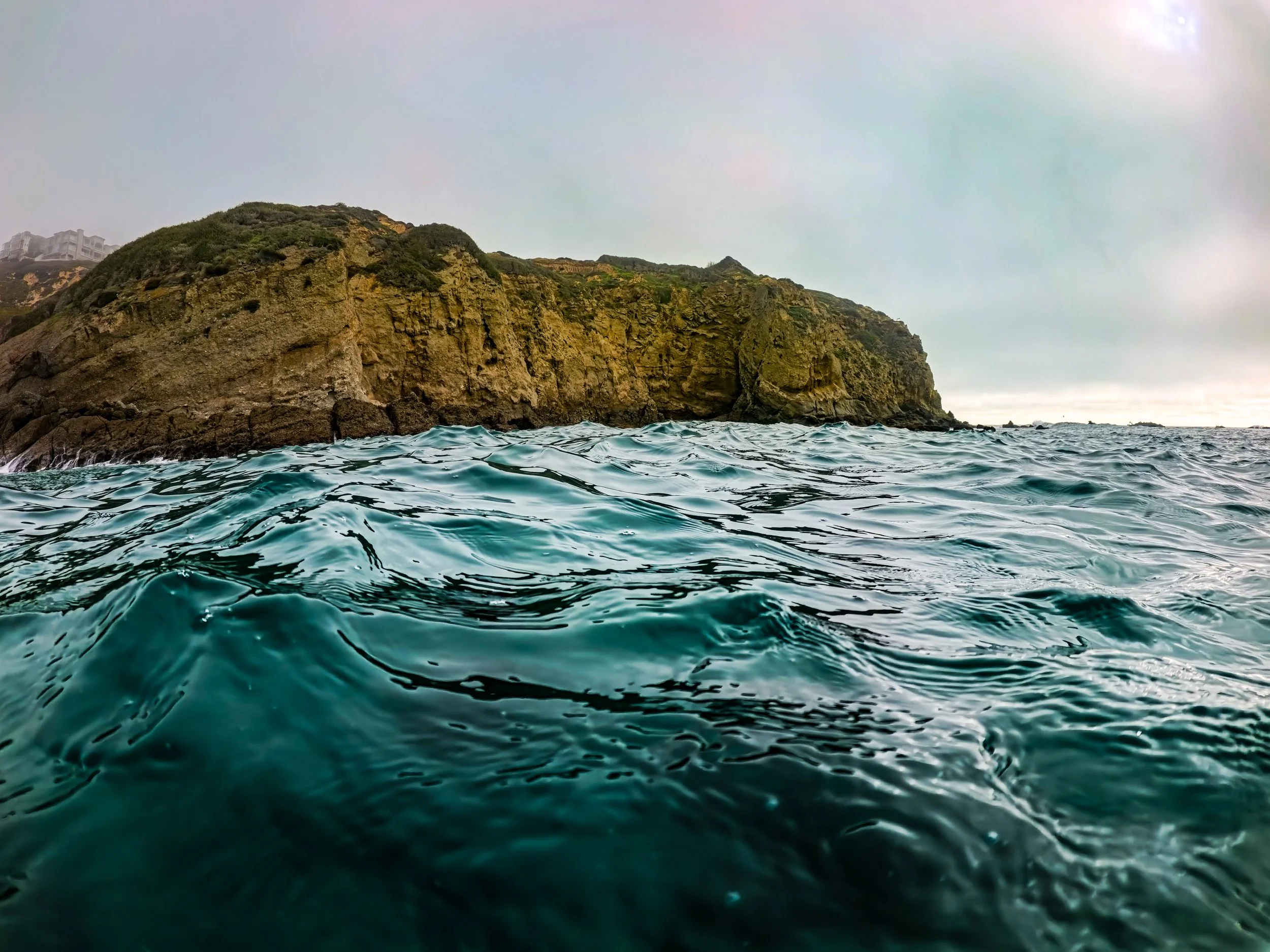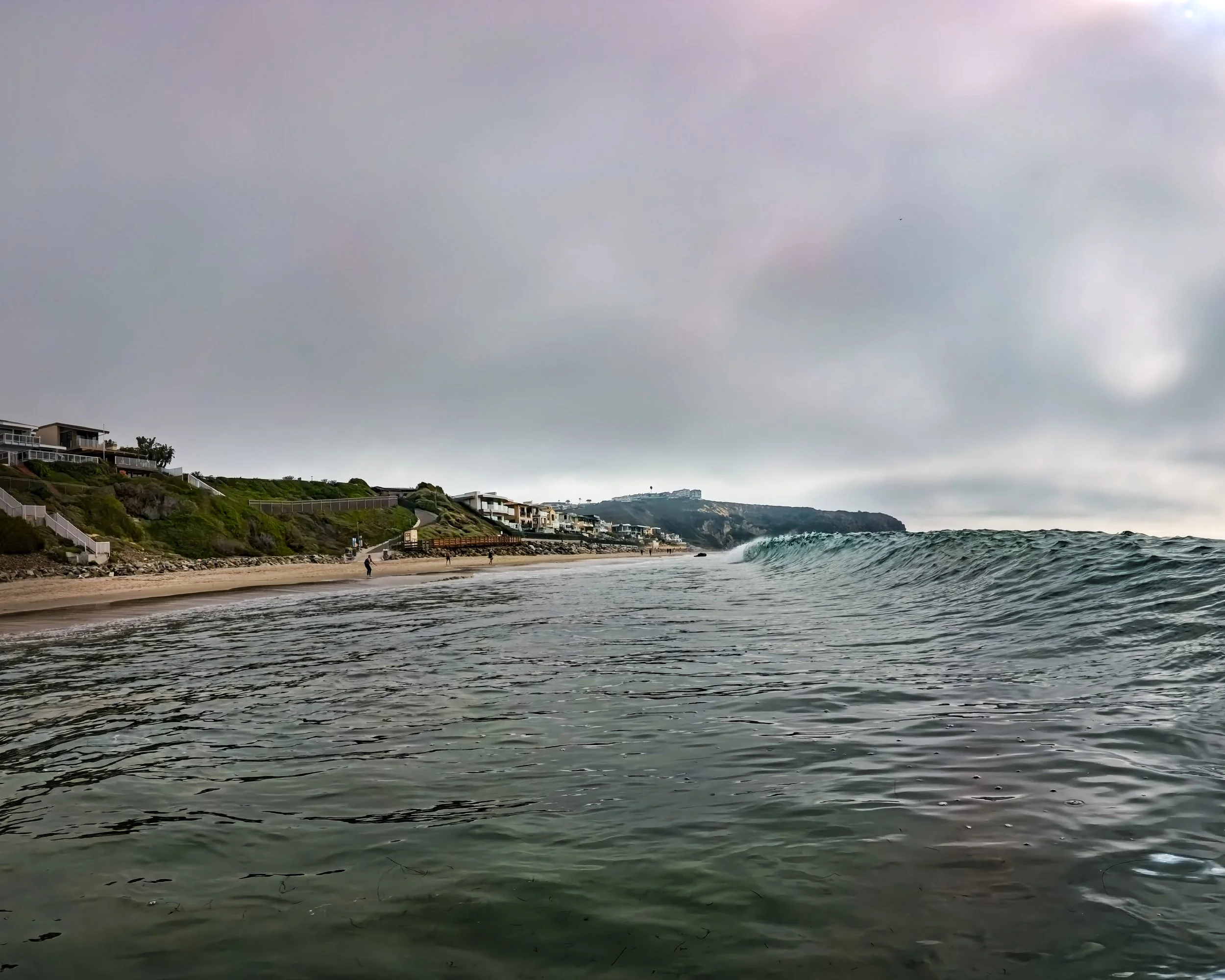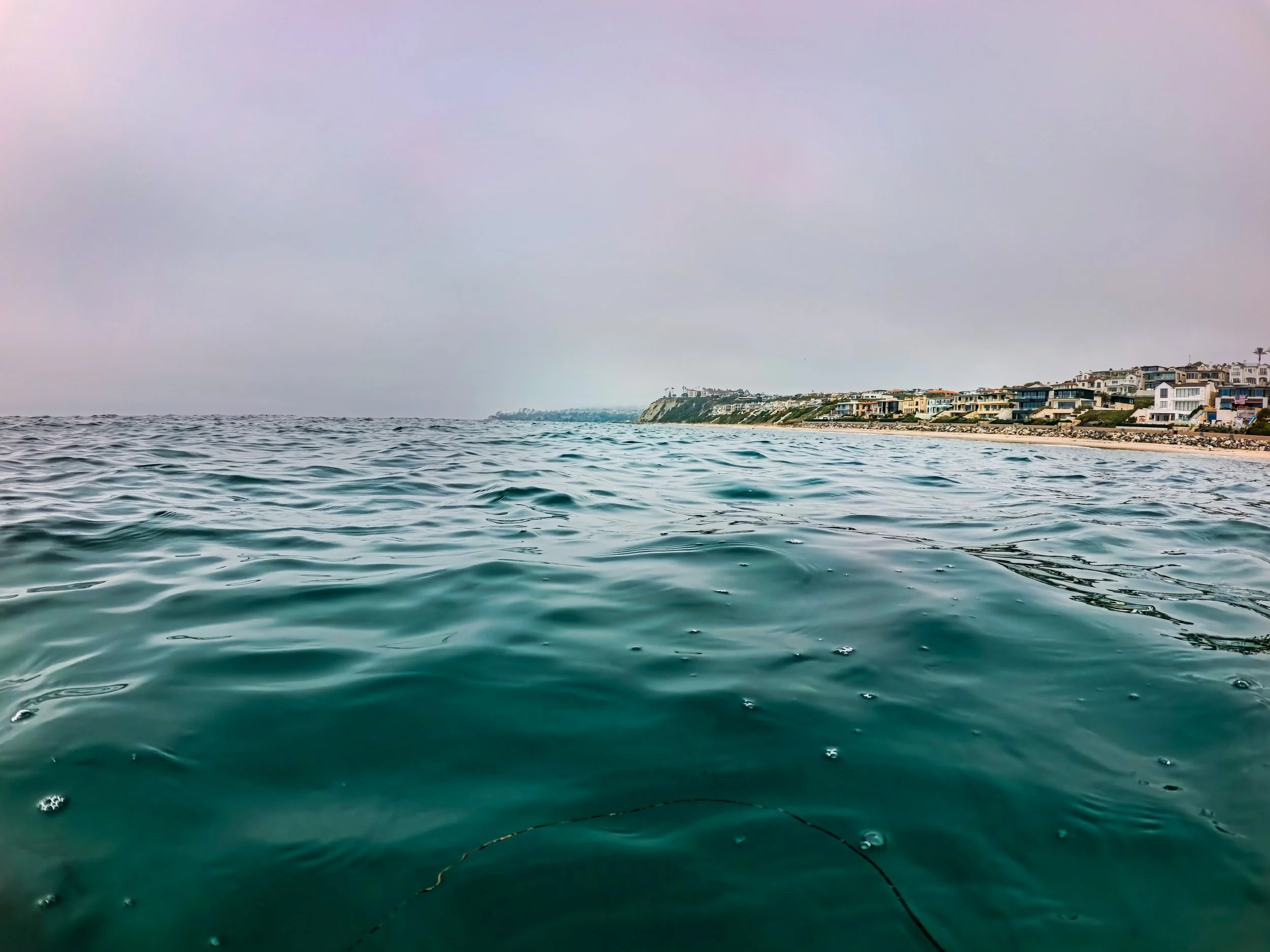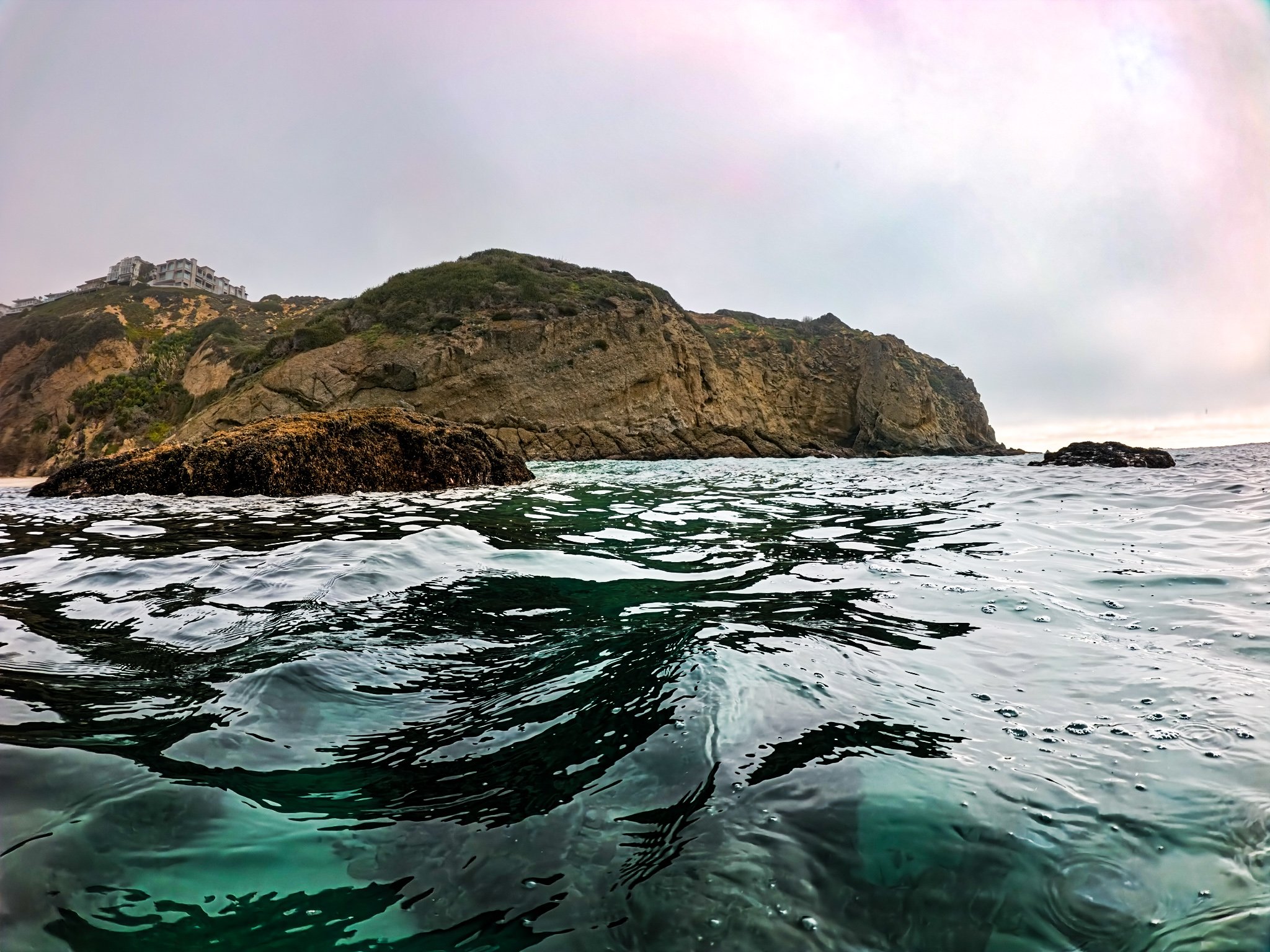 Meanwhile above the surface, things are growing more and more dim. I have to stop a few times to get my bearings because I am having difficulty seeing where I am in relation to land. It is not so socked in that I can’t see the beach but it is extremely fogged in and I can’t see the headlands anymore and the lifeguard tower up at Salt Creek looks very fuzzy. I wipe out my goggles which improves things but not by much.