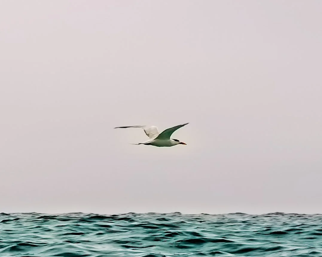 As I keep swimming south , I watch birds, terns I think, fly out to the water and loop around. I’ve noticed that is a common pattern of terns. While pelicans usually seem to be on a journey to get somewhere, terns are more frolickers and tend to fly out and back and this way and that. Once a pelican passes you, they are gone and never to be seen again, but terns are worth waiting for and who knows, you might just see them several times in the period of a few minutes.