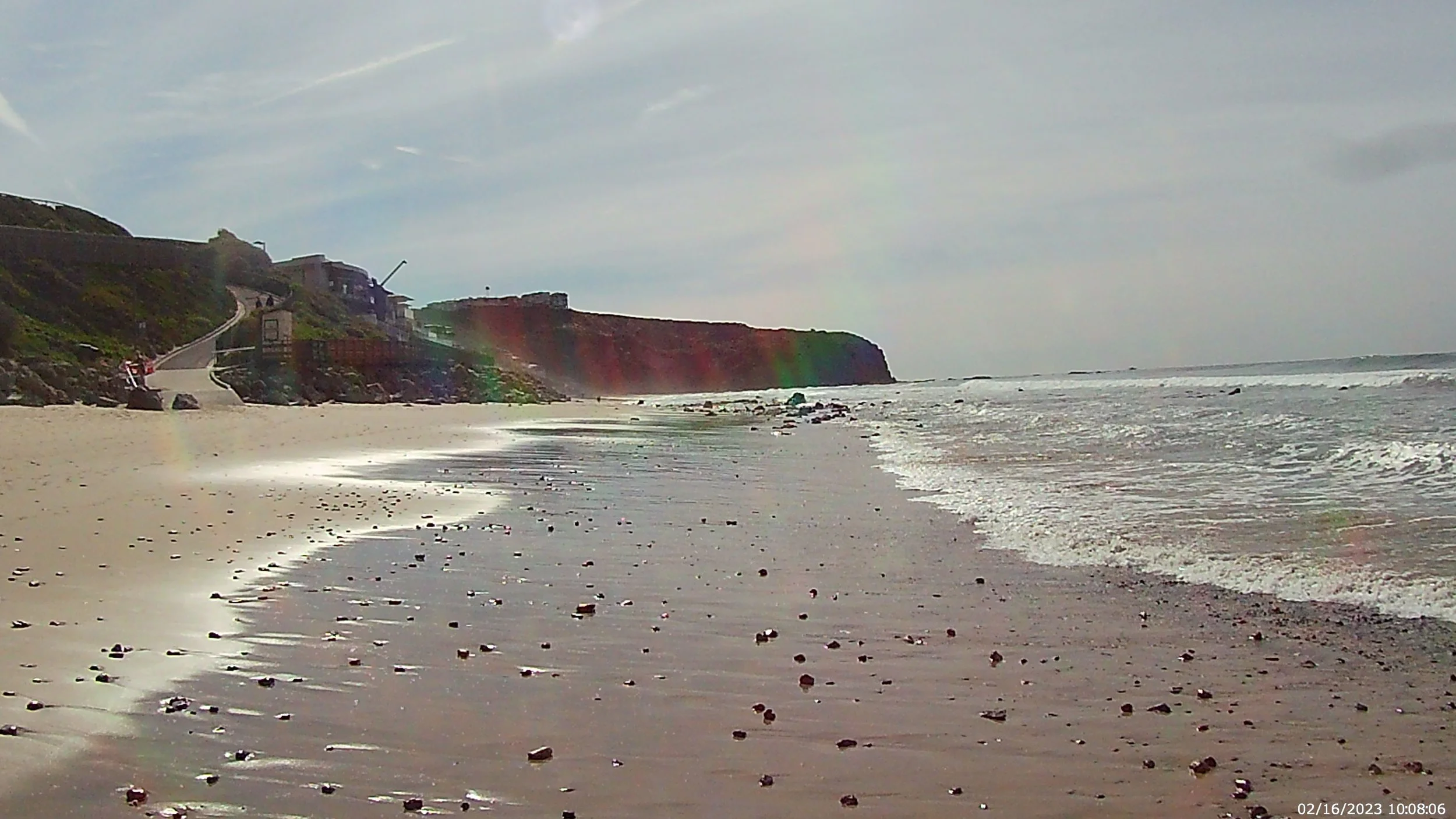 The tide is low and the water feels about as cold on my feet as it did Monday. The water is mostly calm but there are some decent sets of waves rolling in every few minutes. They are still breaking pretty far outside.