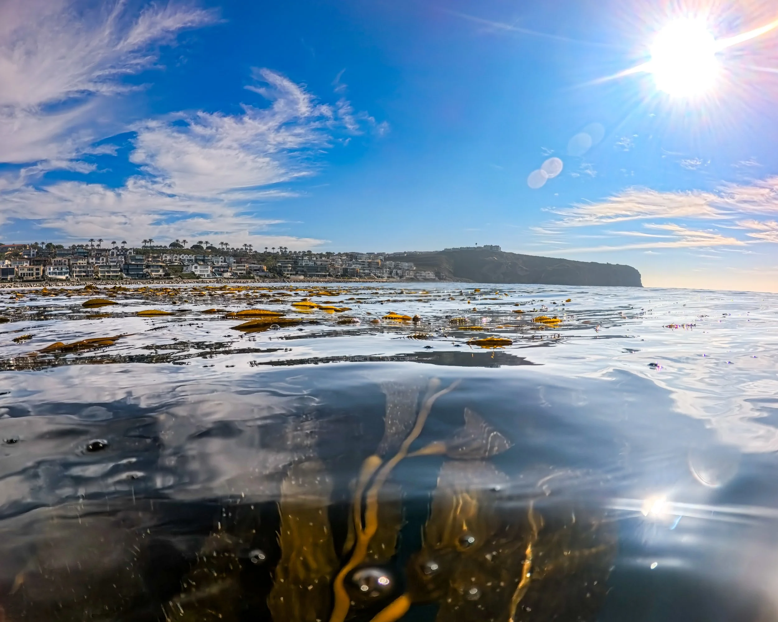 Eventually I intersect with that diver’s boat. There is a guy standing on board holding a spear gun. I ask him if he has caught anything and he mentions a few calico bass but nothing worth writing home about. We talk for a minute about the weather. As we are speaking I am simultaneously noticing the beauty of the surface of the water here that is dotted with kelp leaves poking through from underneath. It is like I am treading water in the midst of fertile fields of green.