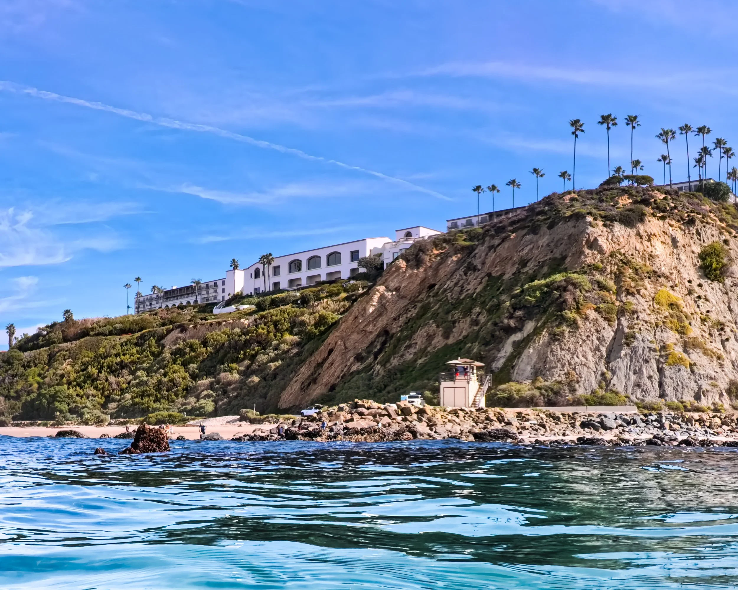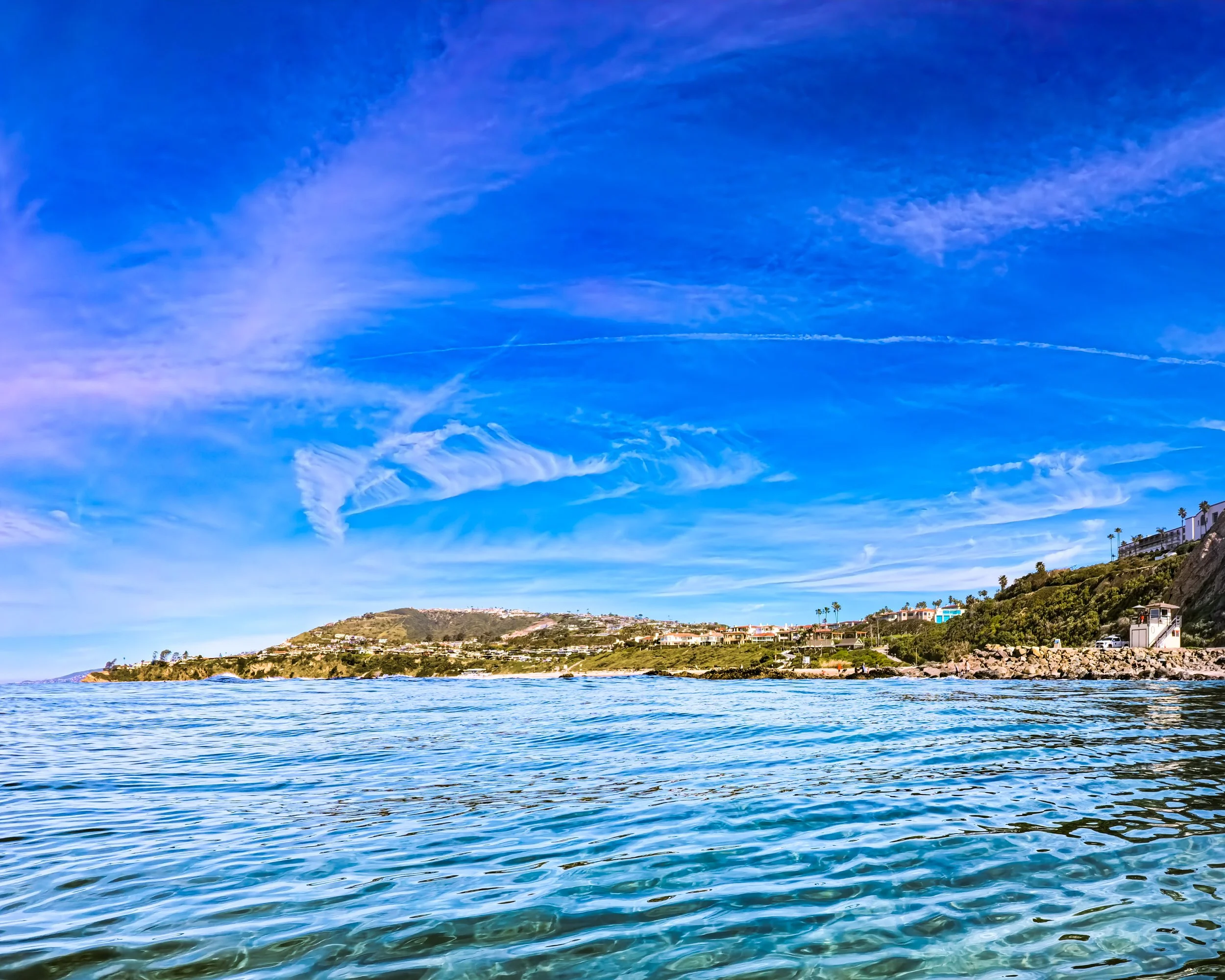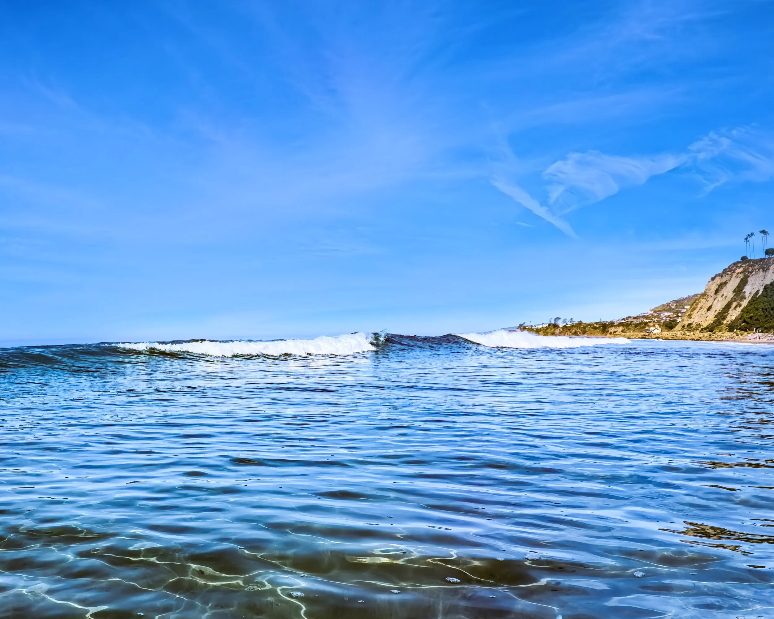 I am swimming north and getting closer to the point break in front of the Ritz. I remain fairly close to shore and I pause to look around. I can actually stand here in this spot where I would usually be further out, but it still seems more shallow than it would normally be. I blame it on the low tide and that sand bar. In front of me directly to the north, I see rocks sticking high up out of the water right in front of the lifeguard tower that I usually don’t see. Small waves are breaking right in front of them. They are small enough that I’m not at all worried. There are two surfers sitting just out past all of this and I wonder if anything is going to break where they are. It seems too far out, but you never can tell. I’d usually be inclined to swim out past the surfers, but they are so far out and there is nothing breaking so I take my chances and stick to my longitude.