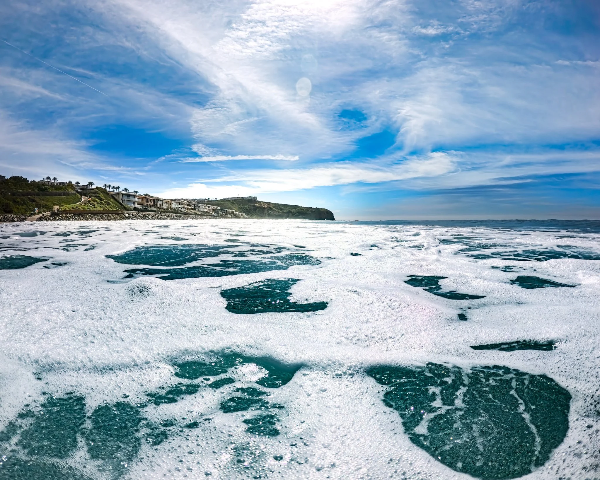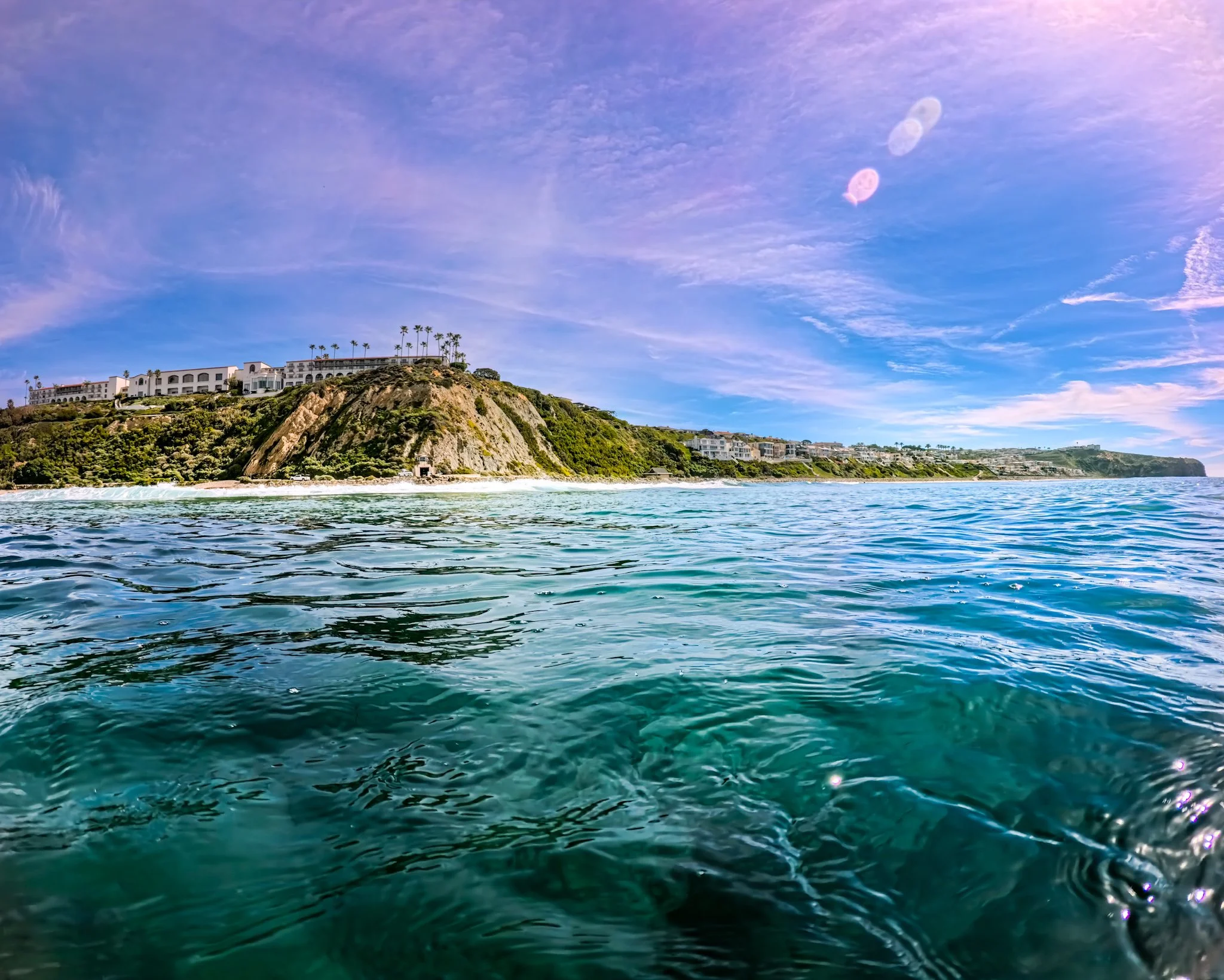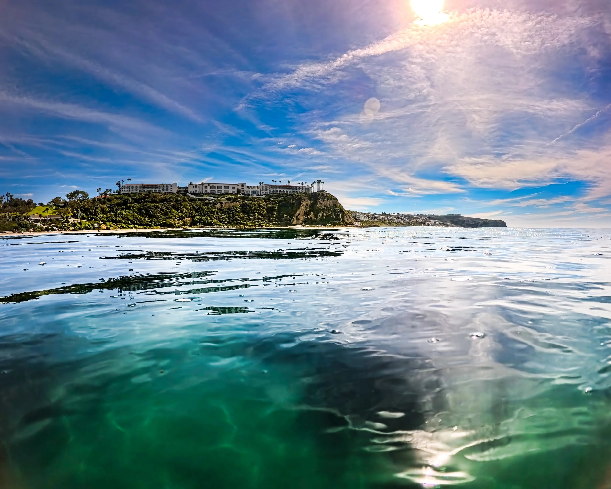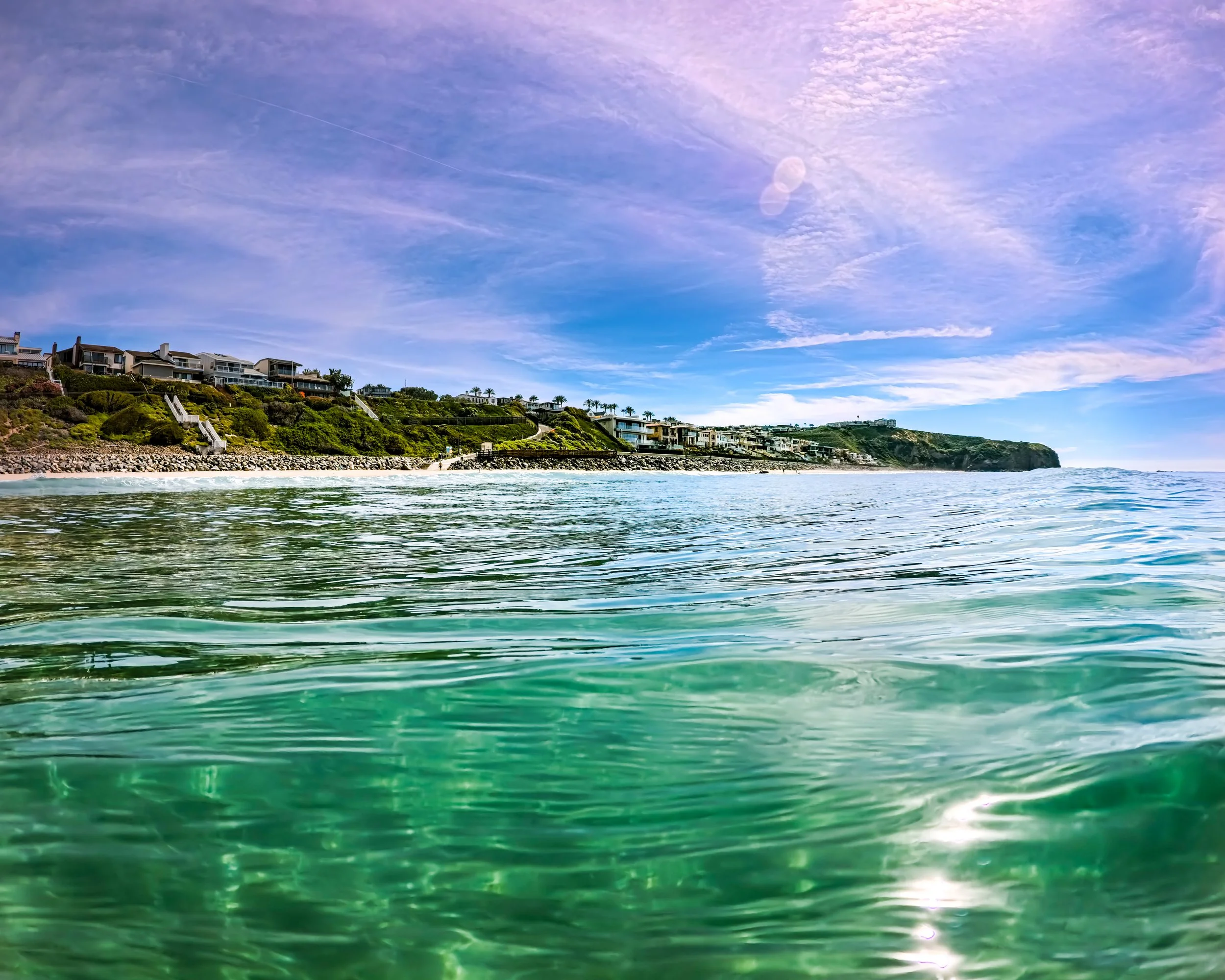 I am swimming north and getting closer to the point break in front of the Ritz. I remain fairly close to shore and I pause to look around. I can actually stand here in this spot where I would usually be further out, but it still seems more shallow than it would normally be. I blame it on the low tide and that sand bar. In front of me directly to the north, I see rocks sticking high up out of the water right in front of the lifeguard tower that I usually don’t see. Small waves are breaking right in front of them. They are small enough that I’m not at all worried. There are two surfers sitting just out past all of this and I wonder if anything is going to break where they are. It seems too far out, but you never can tell. I’d usually be inclined to swim out past the surfers, but they are so far out and there is nothing breaking so I take my chances and stick to my longitude.