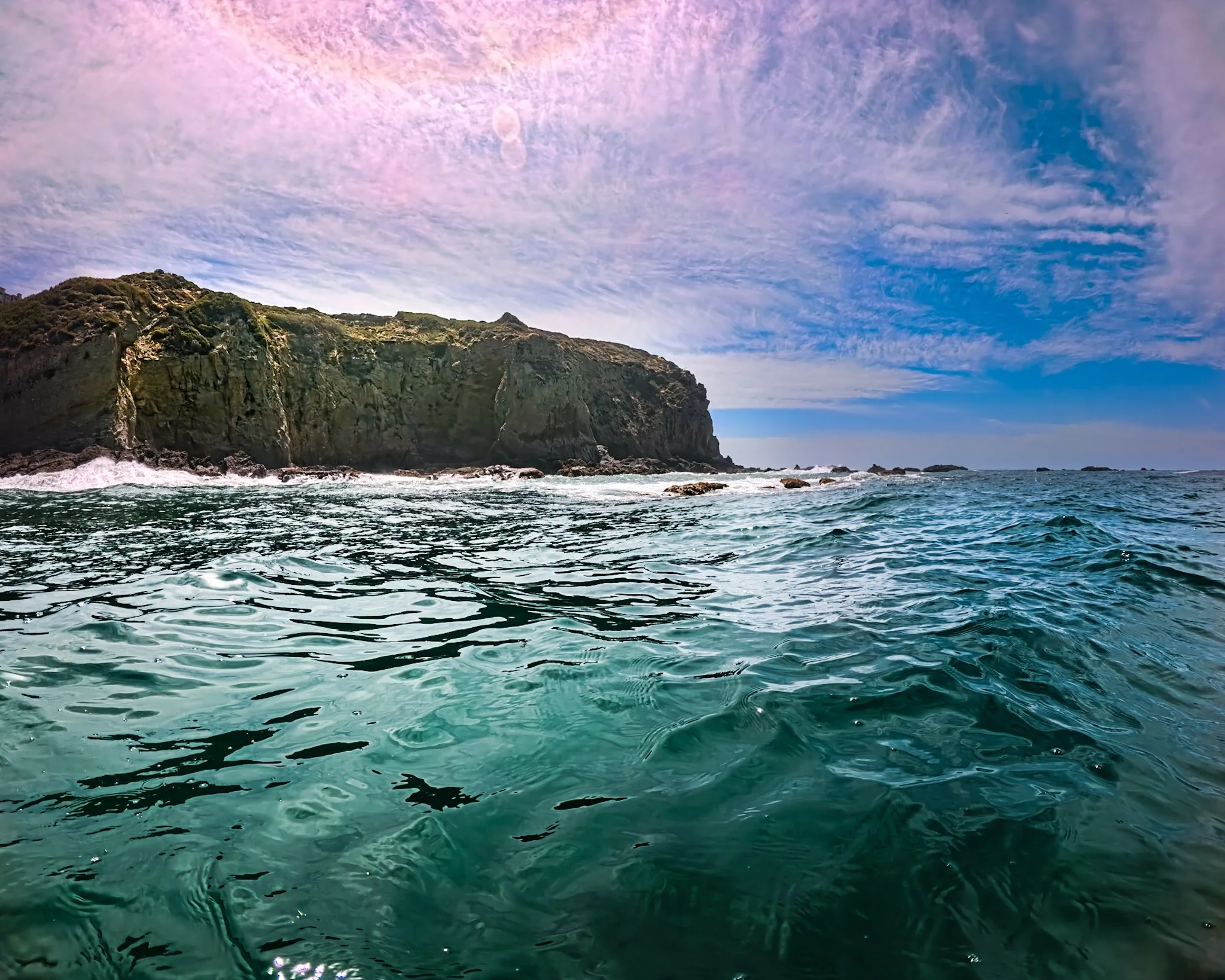 Things get even more bouncy just as I am approaching the headlands. It’s like a pool after the Jolly Green Giant has performed a cannon ball dive. I do wonder what the Jolly Green Giant is up to these days. I think he would like it here. When I get to my usual southern turnaround point, there are large, but unthreatening waves passing by. They break right on top of that big rock closest to the shore about 100 feet out. It is super cool to watch because something about their angle is causing huge explosions of white water on impact. I watch and enjoy a couple of these.