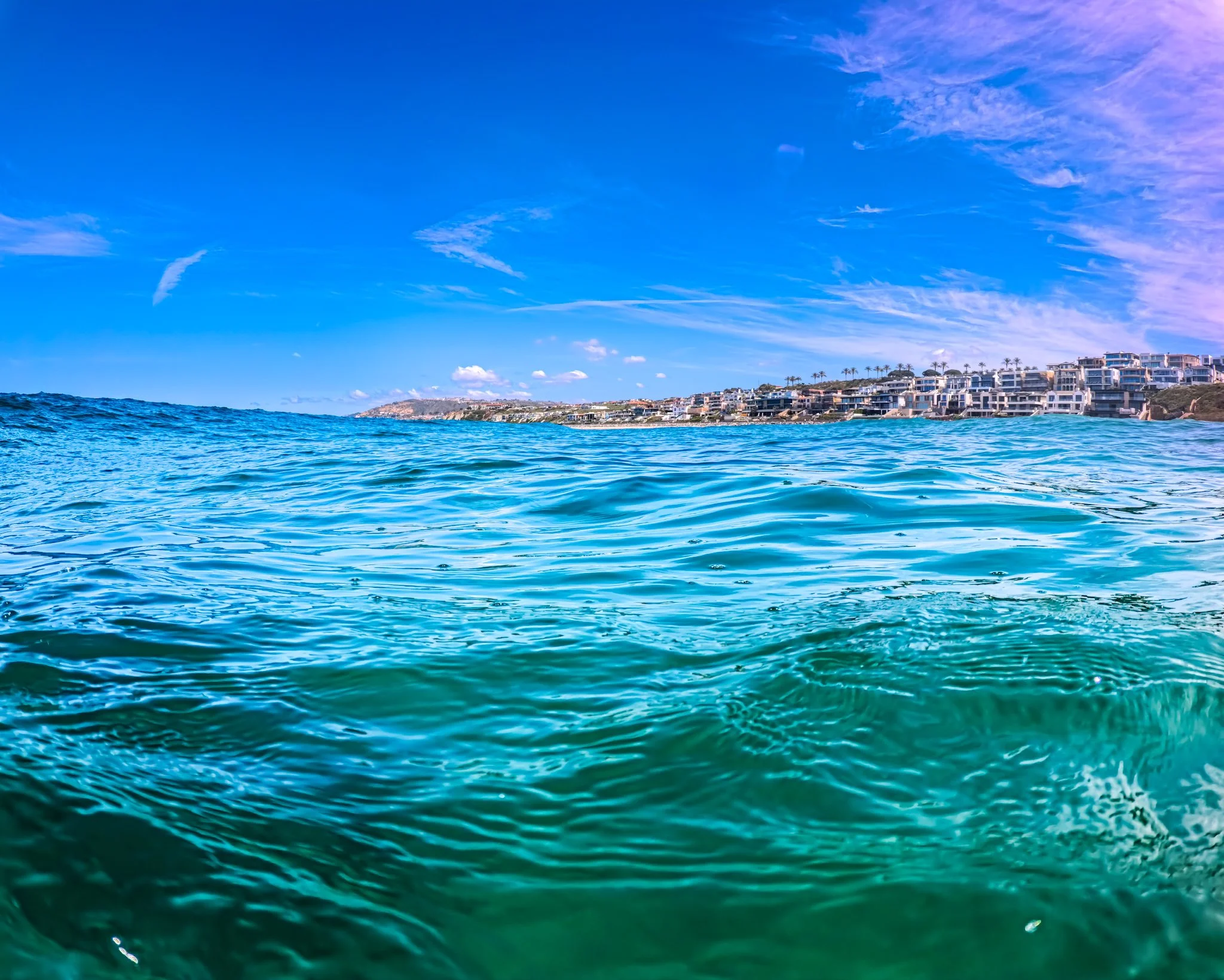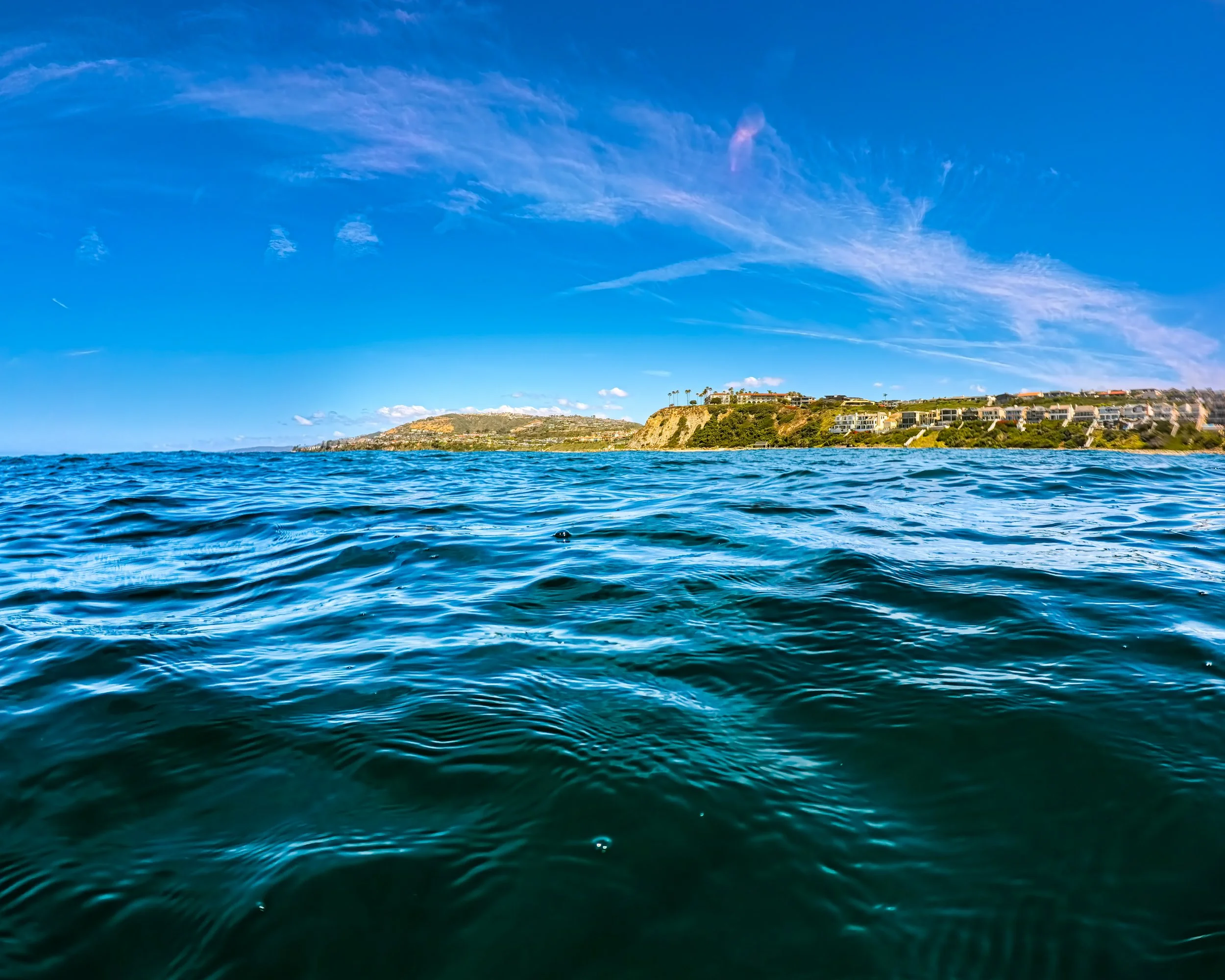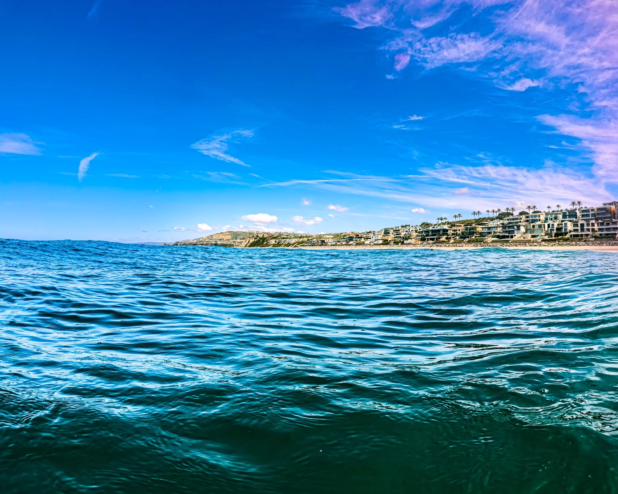 I walk through some waves. They are not big but bigger than my last swim on Monday. Another is coming and I dive under it. I swim out past the surf and then see that paddle boarder. He is still on his knees and it looks like he is aiming to go north. I am heading south and swim about 20 feet inshore of him.