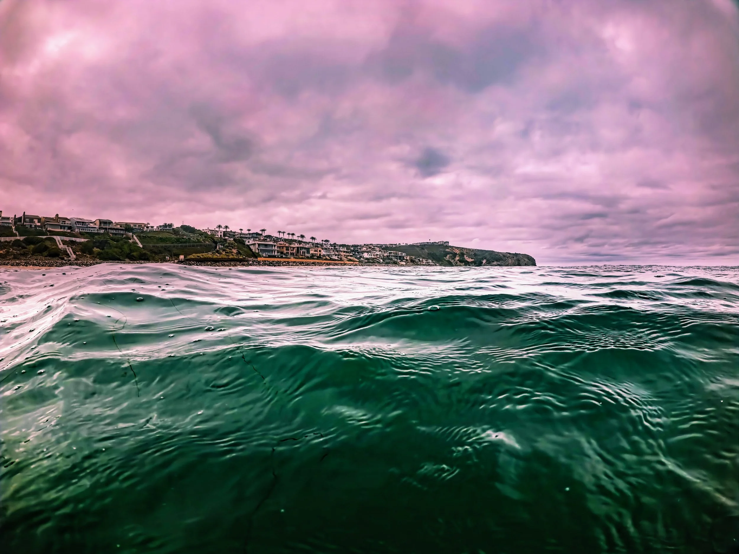 I swim through and under a few waves from a set that just started to roll through. This is mostly enjoyable and I am not even thinking about how cold or warm the water is. I’m just diving under white water and rising back up through the turbulence. It’s a great feeling and the water is brimming with life. Once I pass all of this and am west of the surf I notice that this water feels pretty darn good. Can’t be 63. It’s not 68 either but I am quite comfortable.