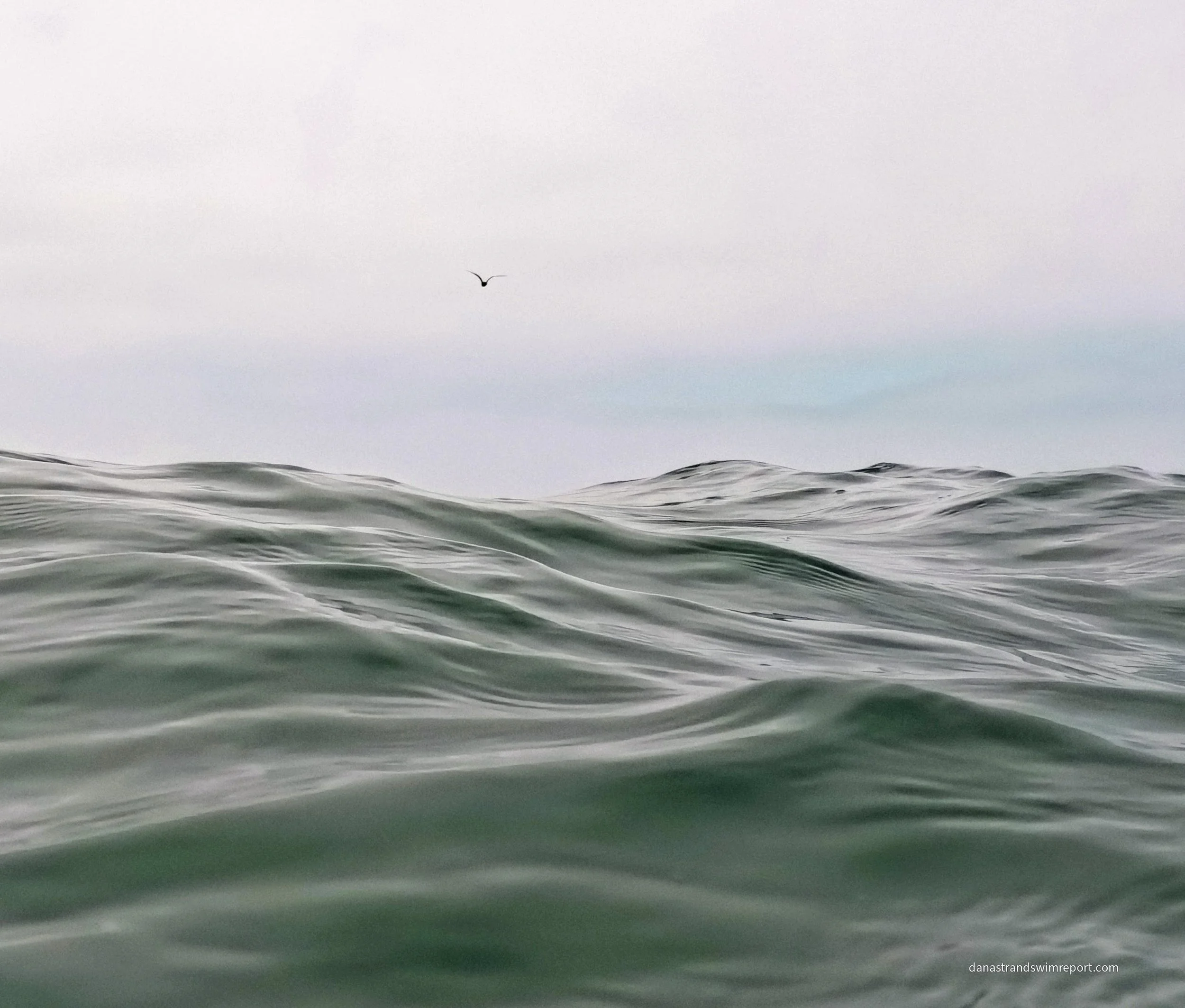 I definitely feel that current on my back pushing me forward. As I breathe and look towards the horizon, I can see just the faintest hint of light blue smattered in the narrow space between the water and the clouds. I like the look of that but it is so barely visible that I wonder how much of it is my own imagination.