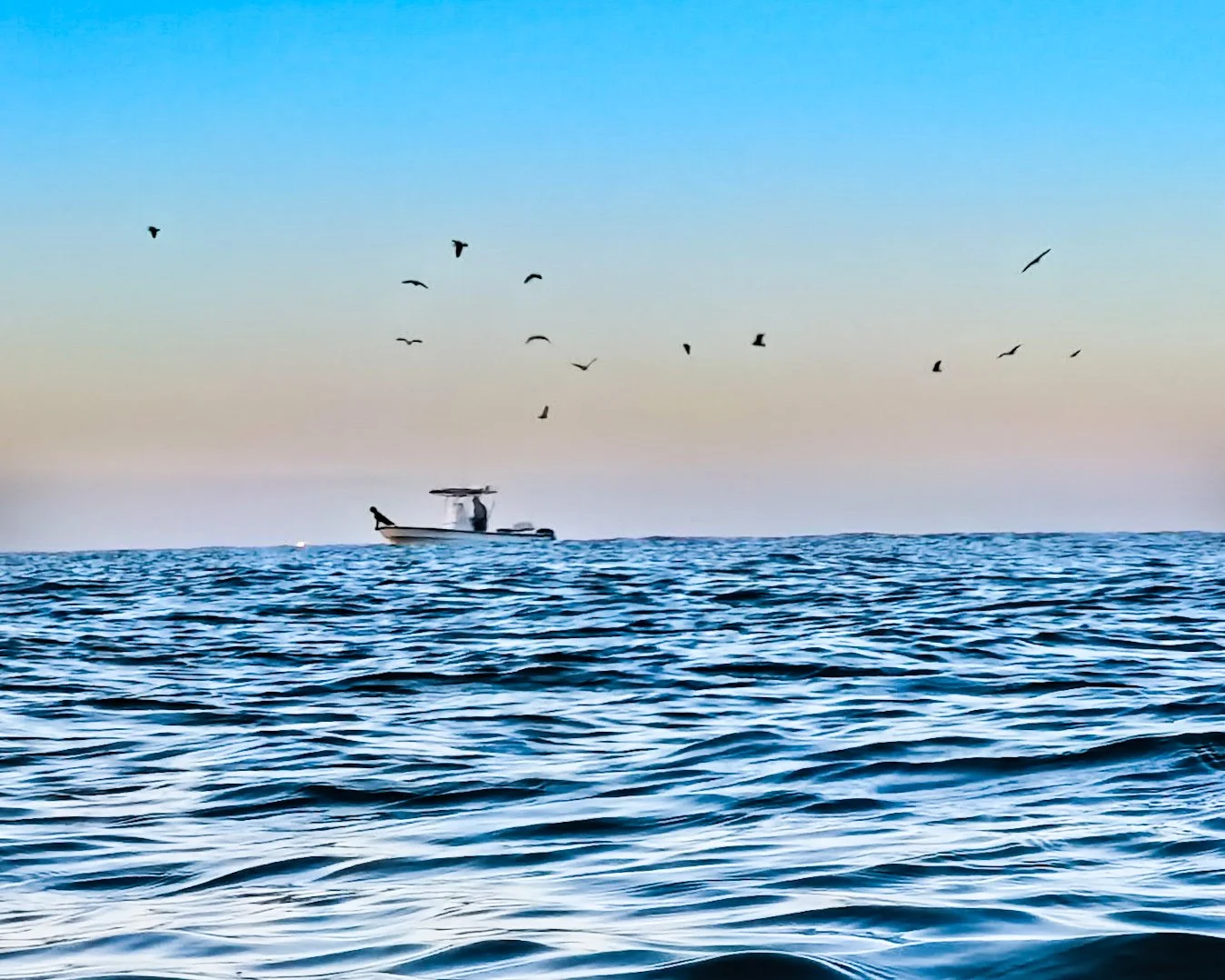I swim a little further and stop again. I keep looking to that cliff. The suspense is building. That sun is gonna come and I do not want to miss this. I look toward the horizon and I see a flock of gulls or terns or both hovering over this small boat that is checking on its lobster traps. There is a dog standing on its bow. I love this. The birds are flying all about. This is all happening about 50 feet away and I am tempted to swim towards them but I have places to go.