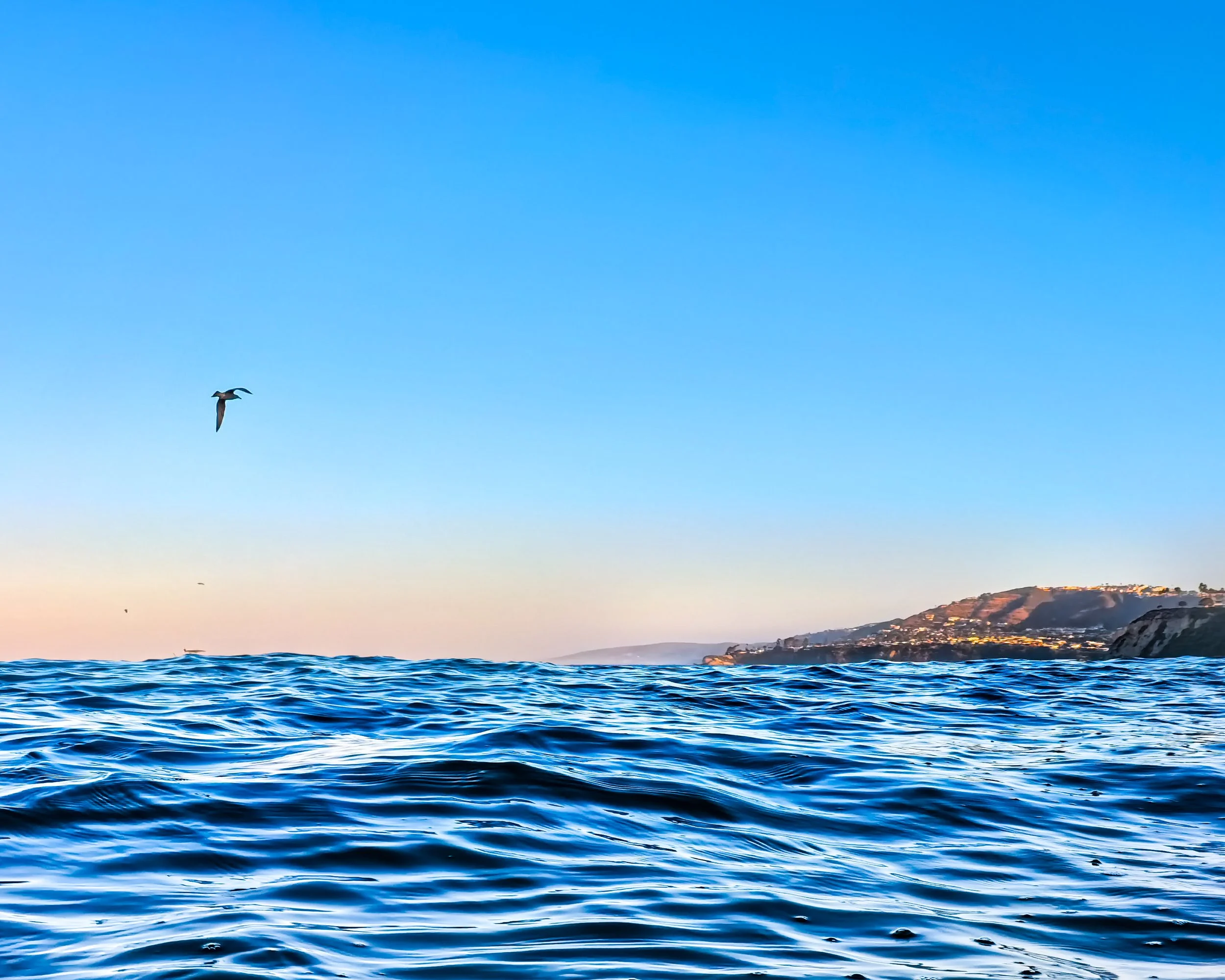 I’m amazed at the speed that I am moving north. Before I know it I am in front of Niguel Shores. I see the beach to the north like a sliver of golden brown. The sun is now well above the bluff. Just a little further and I’m at my turn around point just shy of the lifeguard tower. Everything here is beautiful. The south half of the beach is covered in a soft misty light that looks like it falls down the bluff above like water in incredibly slow motion. I put my face down to look below the surface of the water. I see my arms. Are those attached? Do they belong to me?