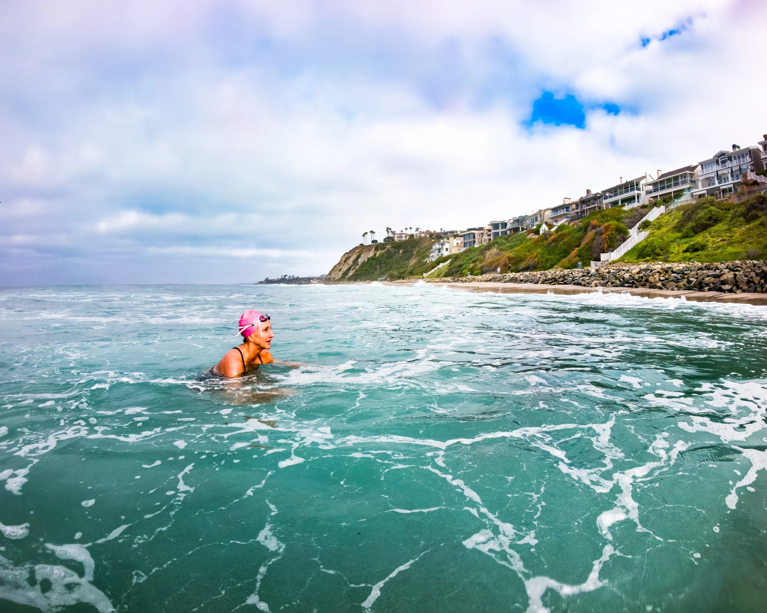 So anyways I get to the parking lot and Barbara is already here and we are walking down the stairs and Barbara is noticing that the surf is indeed much larger than our last couple swims which were nearly lake-like. I’m looking and thinking it is bigger and maybe a little bigger than I was expecting but not so big to give me pause or hesitation. However I am a very impressionable person and as she is commenting on the “huge surf,” I am catching myself believing her. I know myself well enough to see what is happening here so I just plod forward.