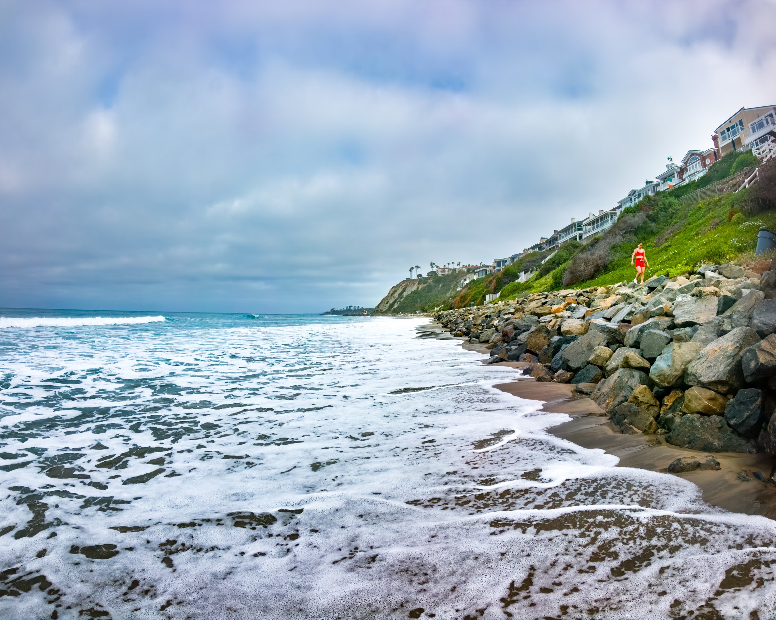 Once we get a good look at the shore, another interesting development arises. There is basically no shore to look at. The tide is coming down from a 5.1 high that peaked an hour ago. I did not anticipate that it would cover the beach. Not too long ago, the highs were above 6 feet and there was still a modest amount of shore left. It’s all about the amount of sand on the beach and the latest large swell has taken quite a lot of it making the shore more susceptible to disappearing in the high tide. So we walk along this make shift (heavy emphasis on “make shift”) trail that runs above the boulders bordering the east end of the shore.