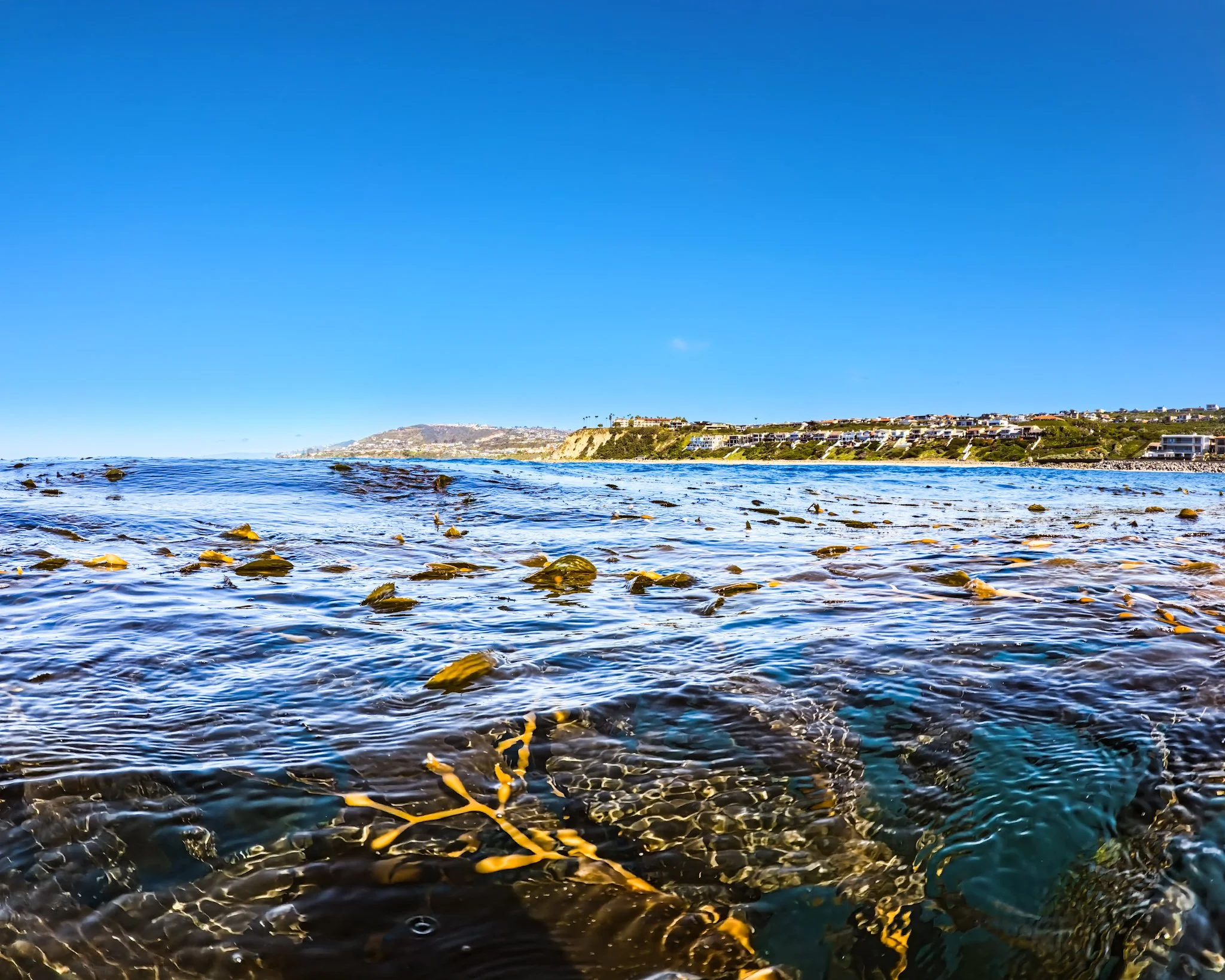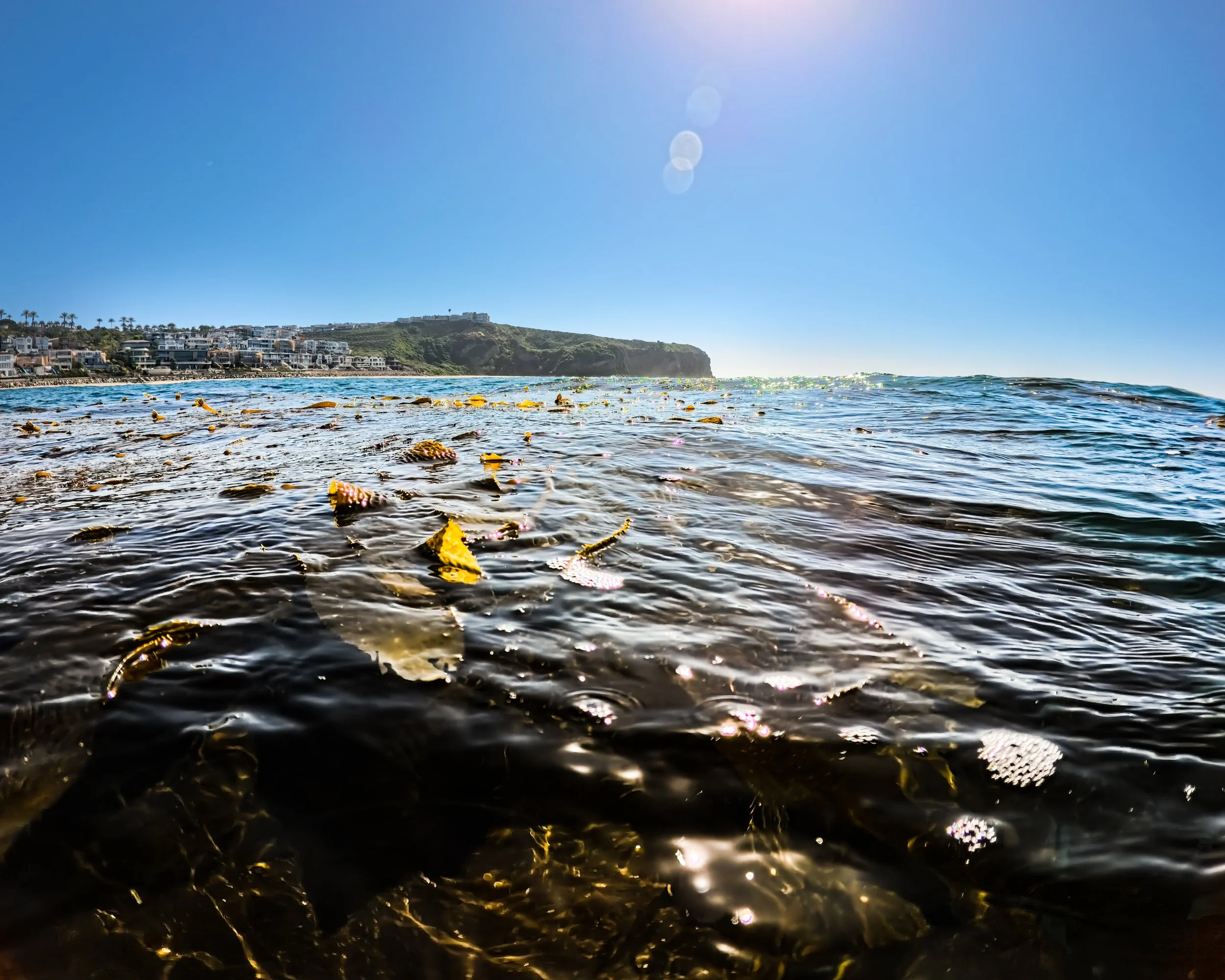 I swim through fields of kelp that seem to be aggressively reaching for my limbs in an effort to hold me back. They wrap themselves around my lower legs and ankles and my camera. I free my camera from my trunks and unravel the vines off of its housing. Then I remain still here for just a while and enjoy the sensation of being held here. I realize this kelp does not hold any ill intentions. It invites me to release my mind from the lifeguard tower up ahead that I have been swimming towards and to let it settle on what is right here right now.
