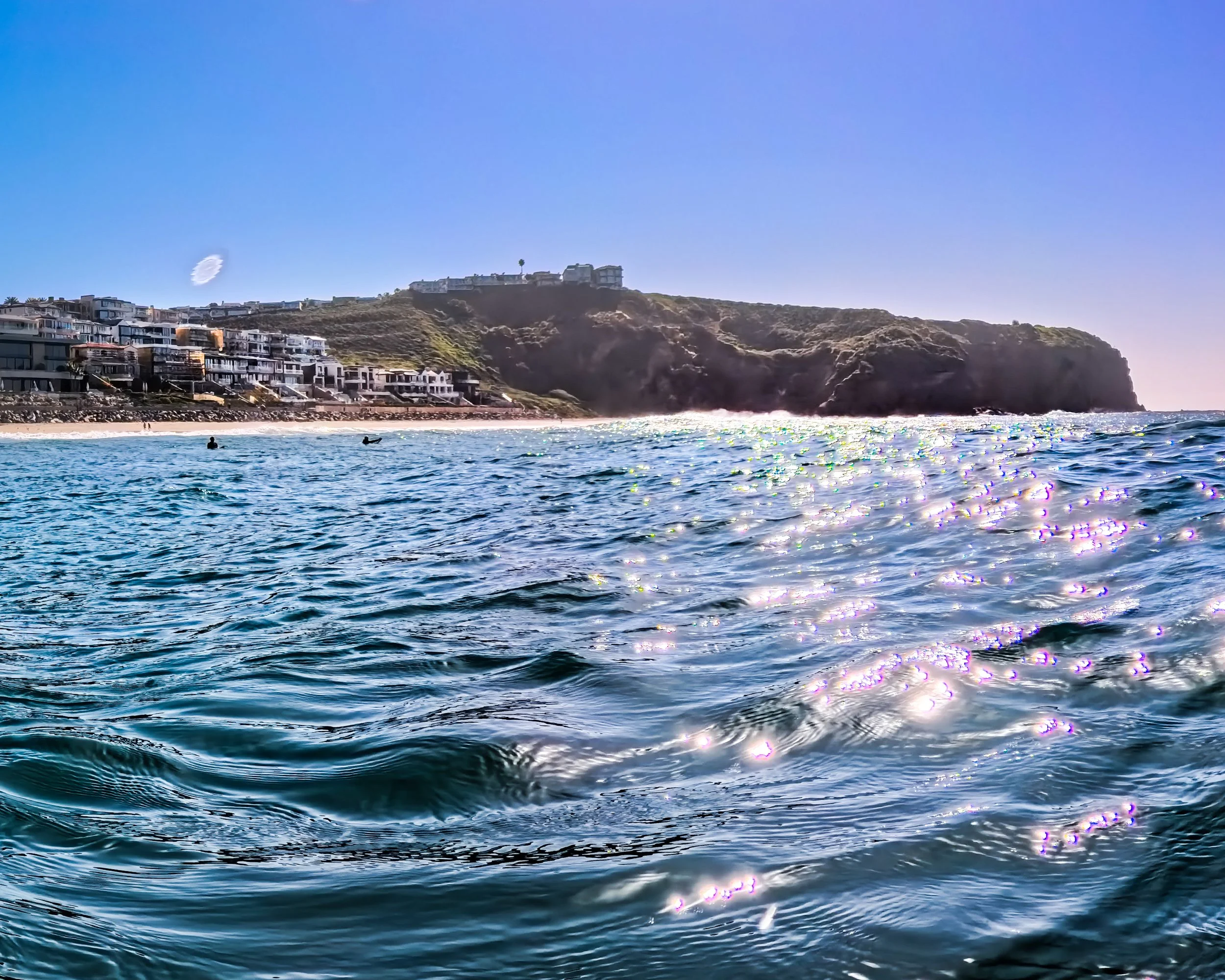 At the end of the beach just beneath the headlands, the waves break into the cliffs and the traces white water shimmer on the water and the surface moves up and down and the rocks at the end of the point appear and disappear. What I am seeing in front of me is like the pendulum of a clock that moves in perfect rhythm. When I begin to swim back up north, the movement of the water is palpable and it feels like breath. I feel the resistance of the inhale and am then propelled forward by the exhale…again and again.