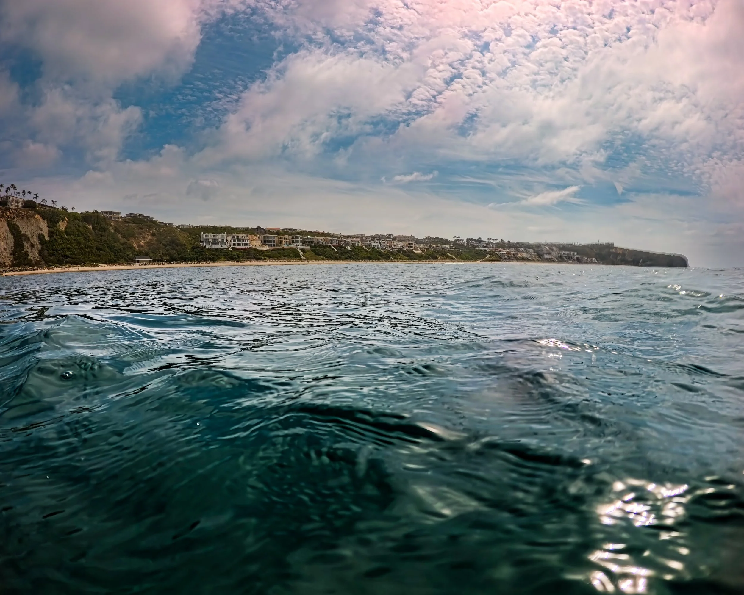 I walk to my usual spot and head out into the water. The water has that same feeling that I remember from yesterday - a sort of gentle coolness that seems cold to the touch but translates to something much warmer once you are immersed in it. I think I am past the surf and I am about to start swimming but then a larger wave comes that is definitely going to break in front of me. I am continuing to walk forward and trying to get a picture of the approaching wave. Then I feel a rock and I trip over it just as the wave breaks. As I toss a bit in the white water, I can see I am in this little patch of cobble sized rocks. And I was just telling someone who was concerned about rocks that there were no rocks right here.