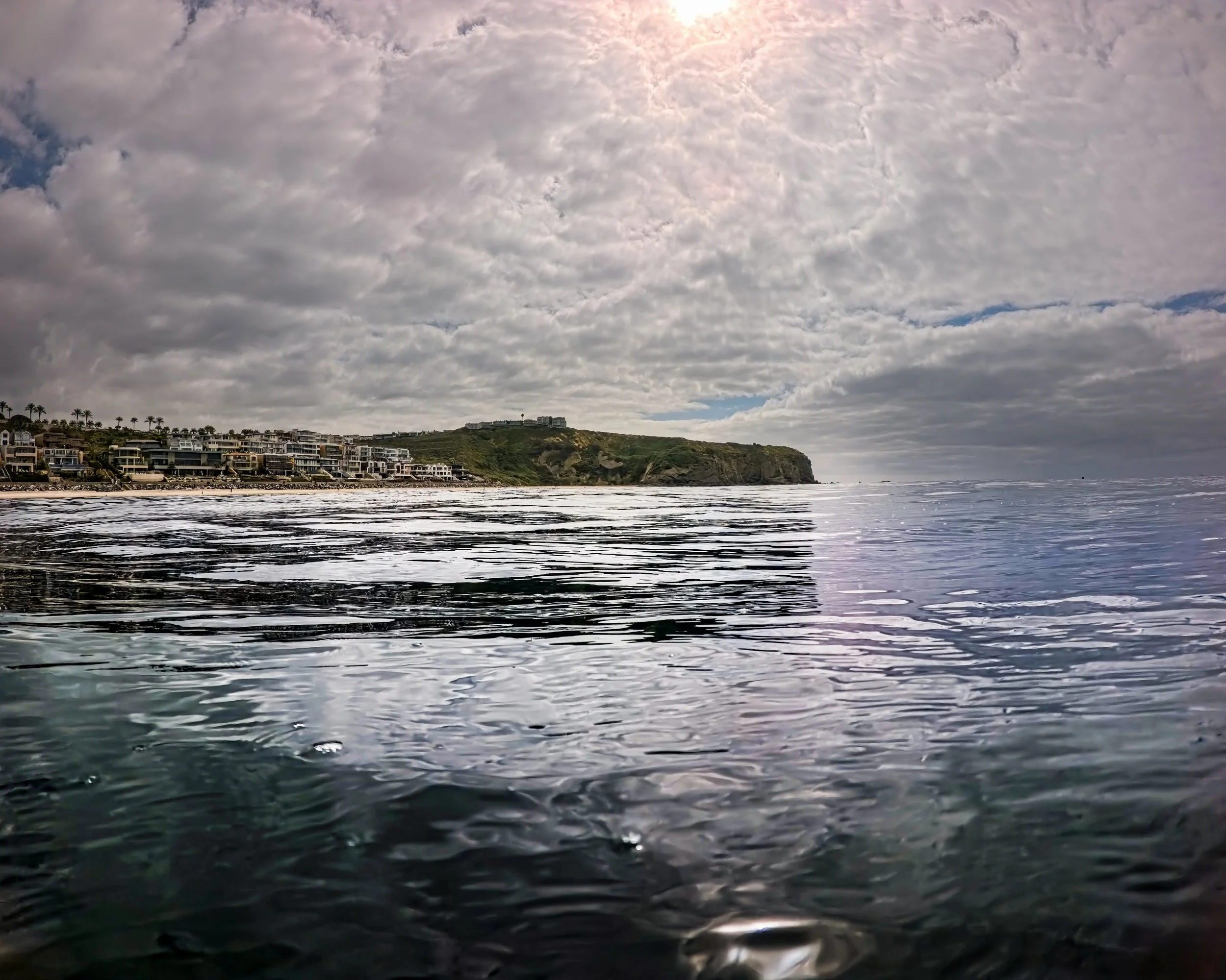 There are a couple blue patches above but not enough to let in any significant sunlight. It definitely looks and feels cloudy. I’m wondering, do I really want to swim today? Yes I do. Conditions are otherwise perfect today and surf will be picking up tomorrow so I’d like to capitalize on this last day of small surf.