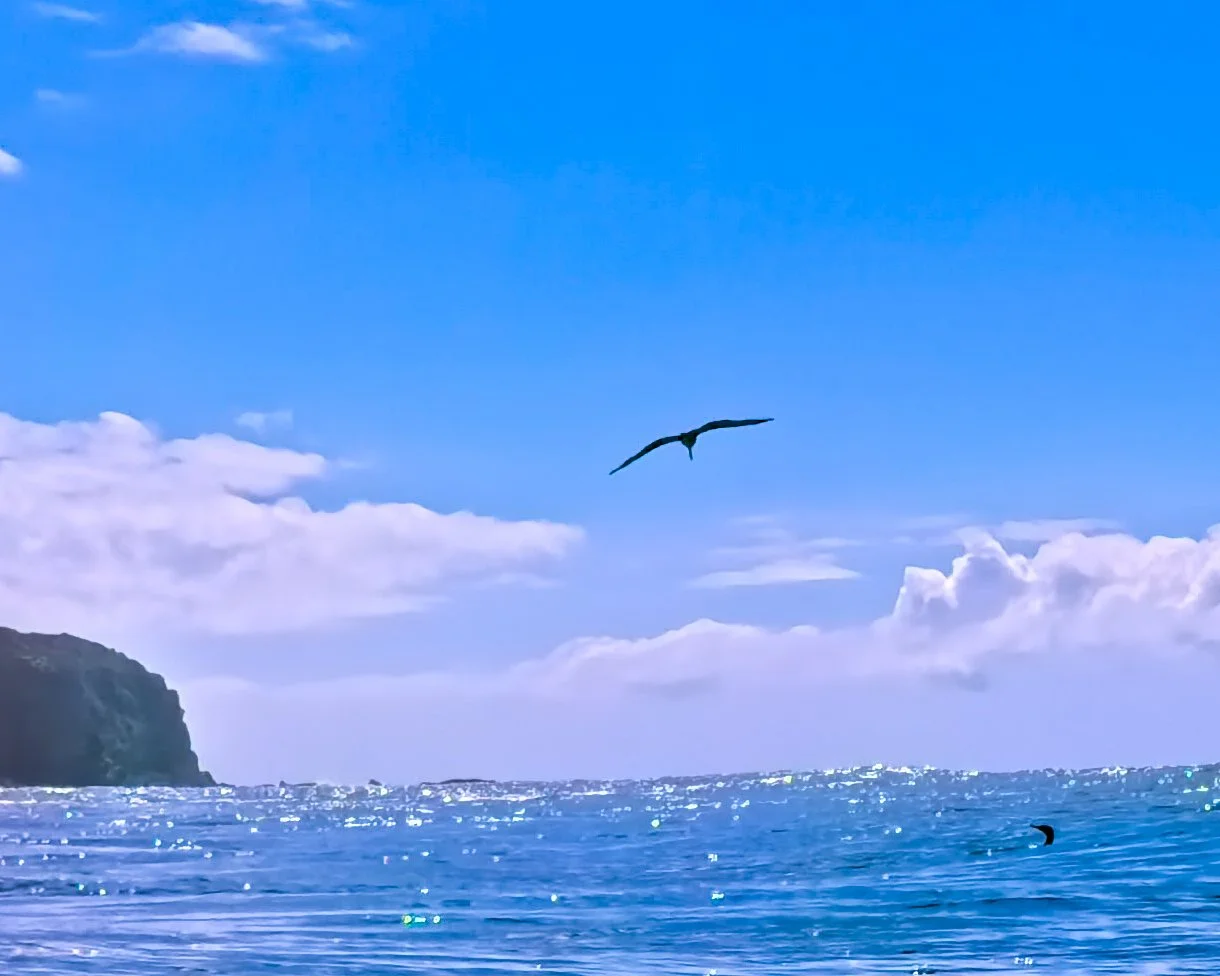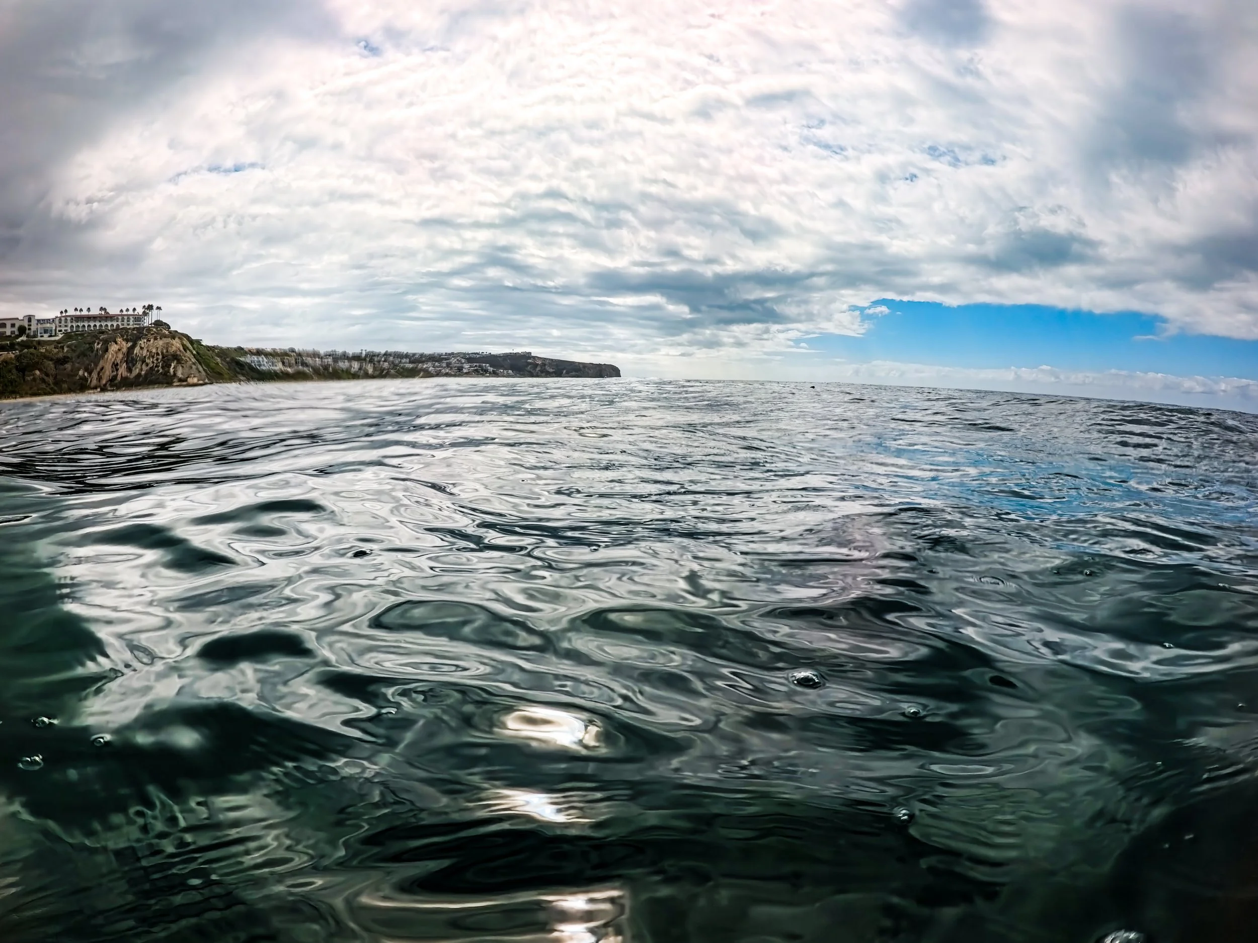 Another fantastic swim! They just keep coming. Every one so different and special. Almost all of my swims are one of two routes I follow. How different could they be? Very different! Today I left at a little after 10:00 and skies were mostly cloudy. There were scattered patches of blue sky over the water casting pockets of deep blue ocean surface amidst otherwise grey and silver. The sky was pretty interesting but the air just had a somewhat gloomy demeanor and the water was bumpy.