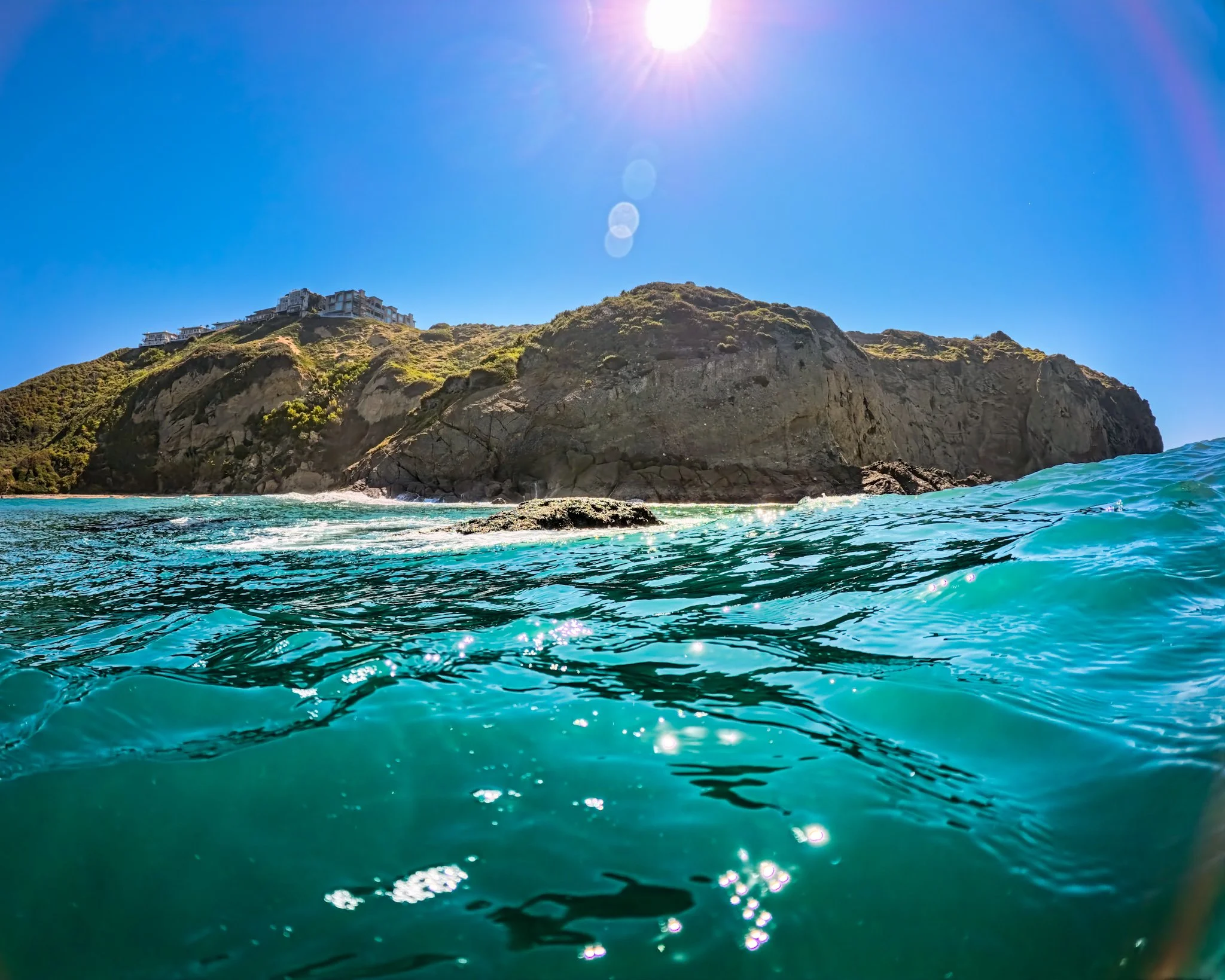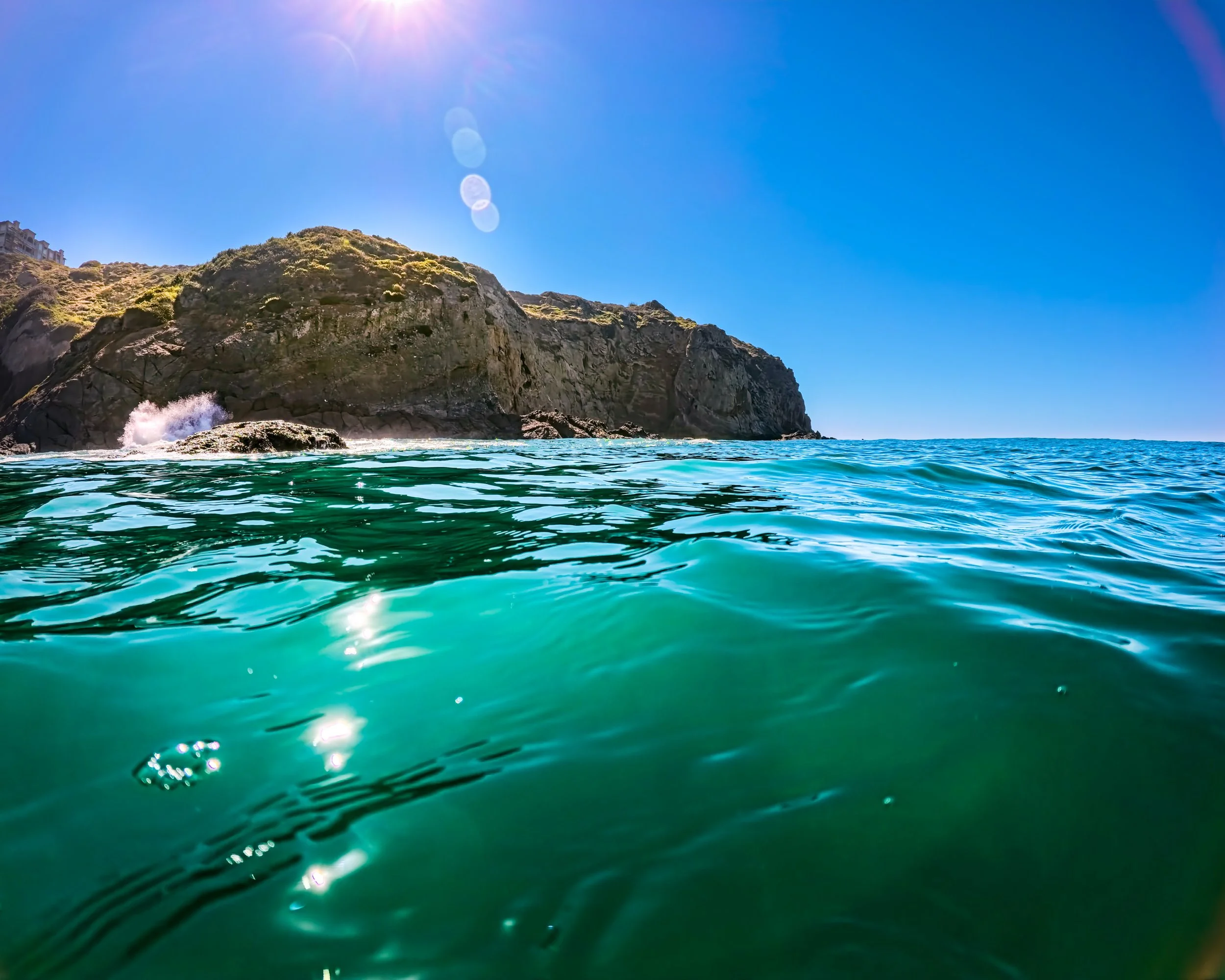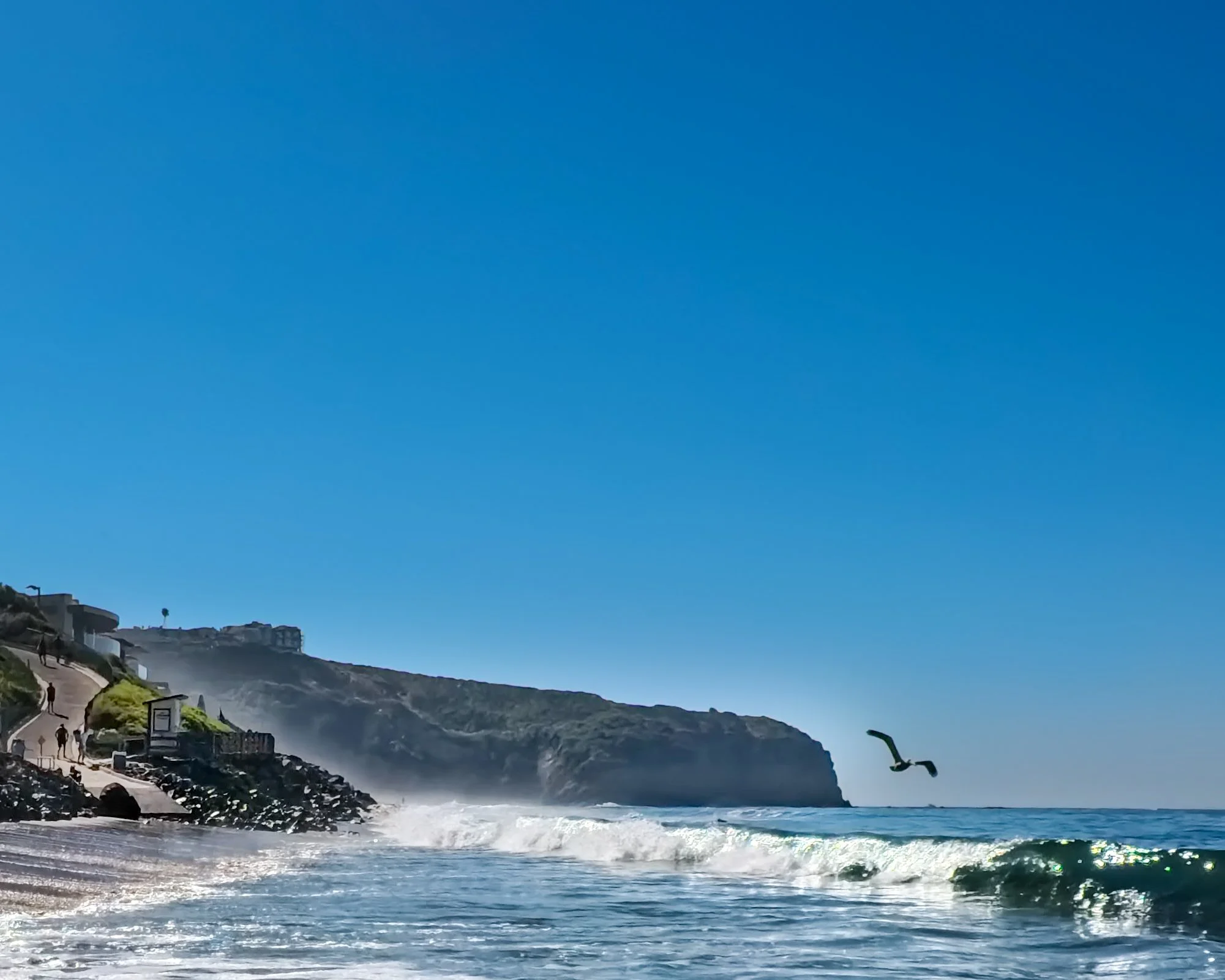 Tide is high again as I get to the beach. Like yesterday, the waves almost break right on the bare shore. However the waves are a notch smaller today. There is also just a little more sand at the bottom of the concrete ramp making for a more secure transition to the shore. The water rushes over my feet, hits the rocks on the opposite side of the beach and then retracts back into the ocean splashing my legs in the process. I can quickly tell that the temperature of the water is going to be easy and gentle.