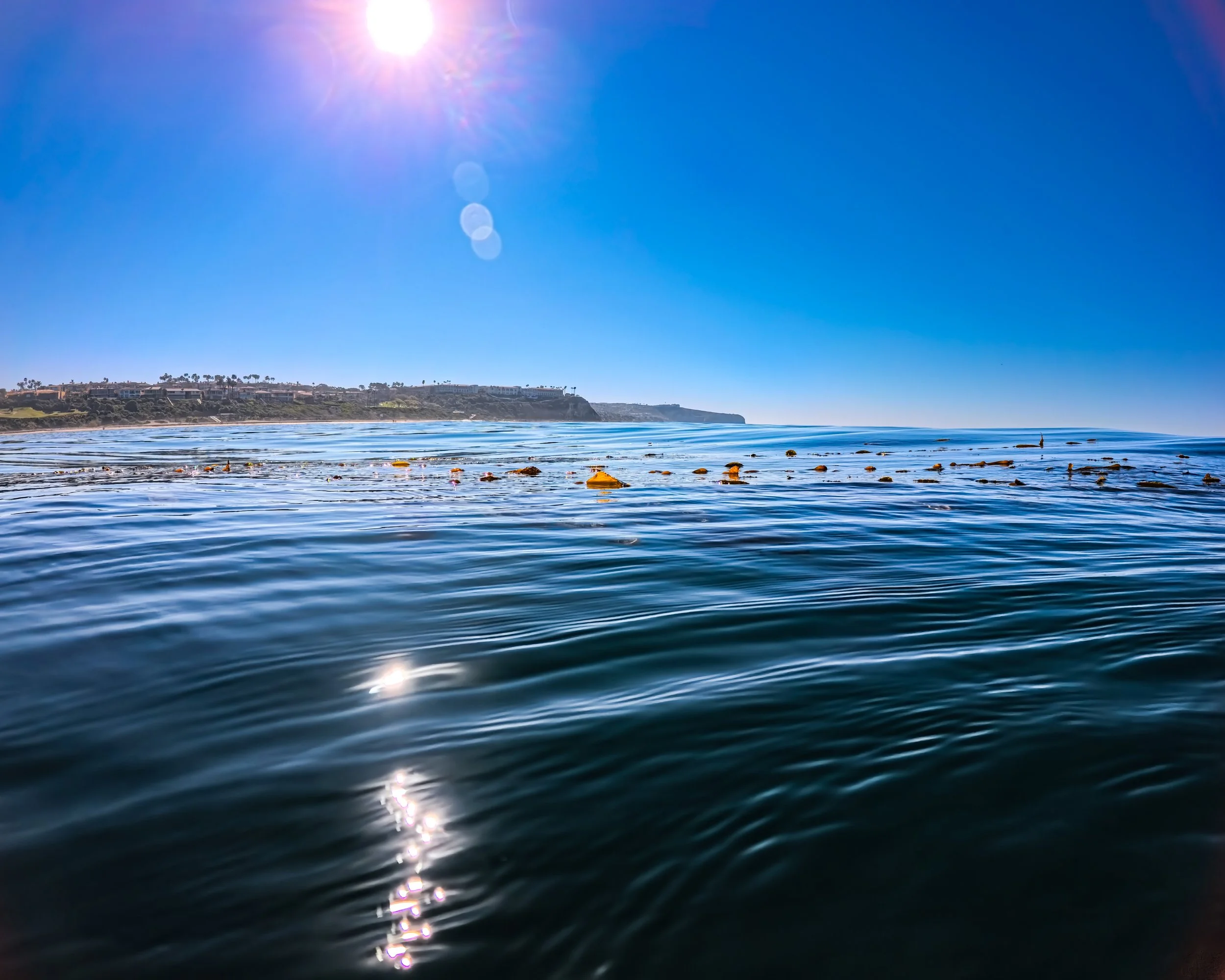 I pass the point below the Ritz and I just swim and I swim and I swim. I peer up every now and again to see that ridgeline that sits between Monarch and Three Arch. It’s a nice ridgeline as ridgelines go. Every once in a while I stop to just take in what’s around me. It’s all still and quiet and I hear the chirps of birds in the background but can’t see the birds. I’m past the surfers that populate the southern half of Salt Creek beach. I’m getting close to the northern bathrooms and the golf course. I can’t see much below the surface. It’s been pretty cloudy below for the past couple weeks. Then I see a big branch of kelp appear seemingly out of nowhere right in front of me. I reach for it and let my hand slide along the surface of its slippery leaves. I stop and look out on the water nearby and I can see the bulbs poking up through the surface. The sun shines on the golden transparent foliage that floats up top. It’s all pretty gosh darn beautiful. You should have come. You would have liked it.