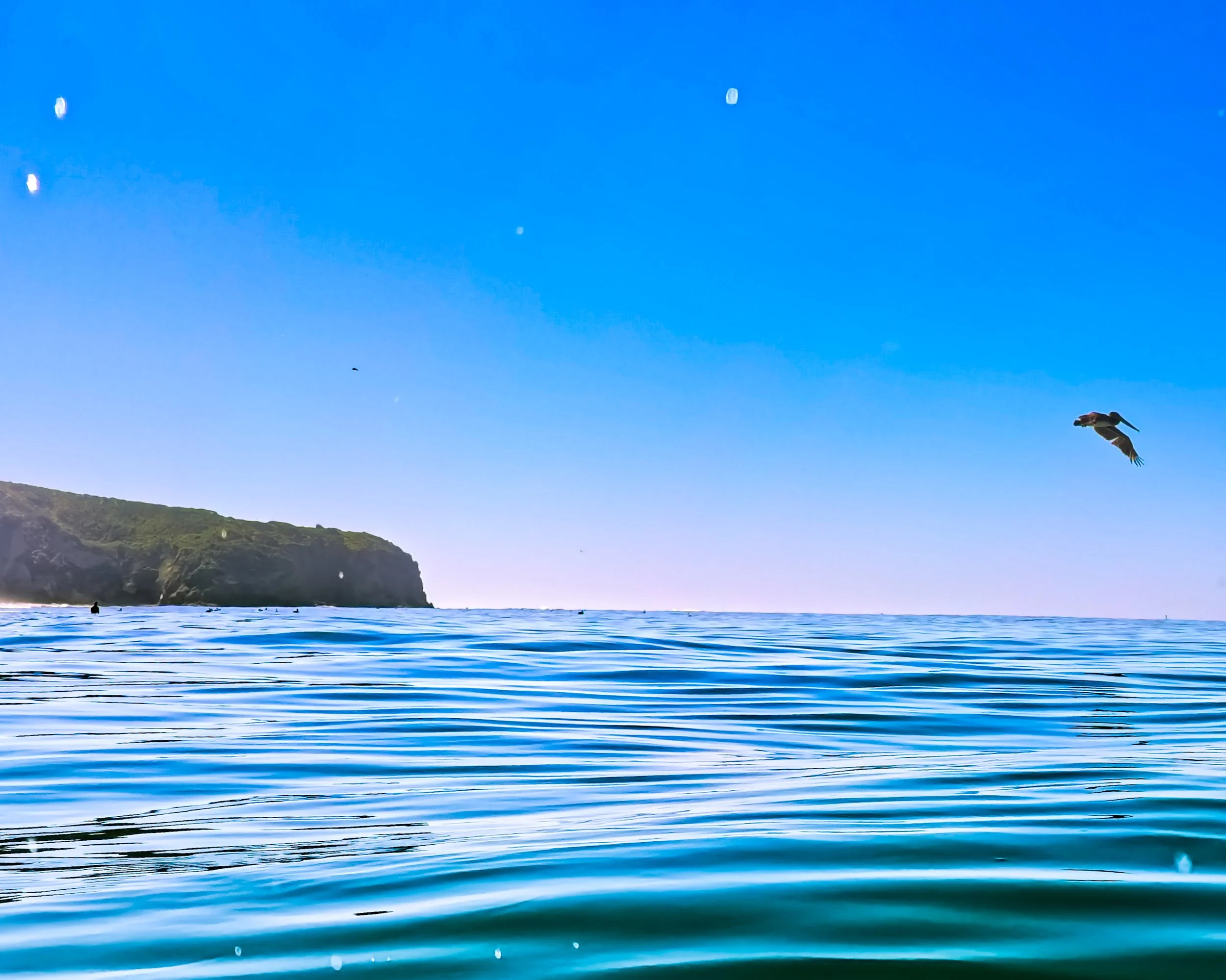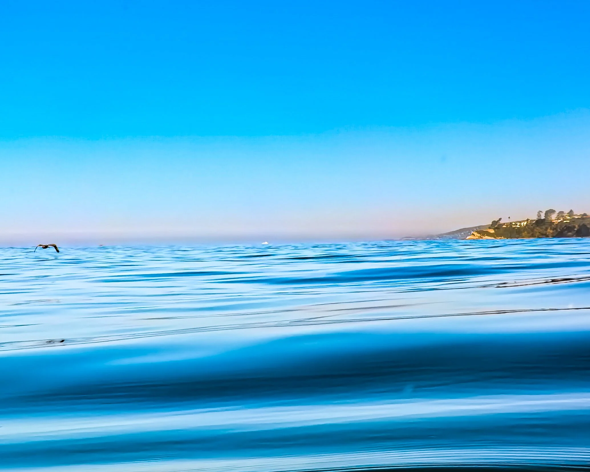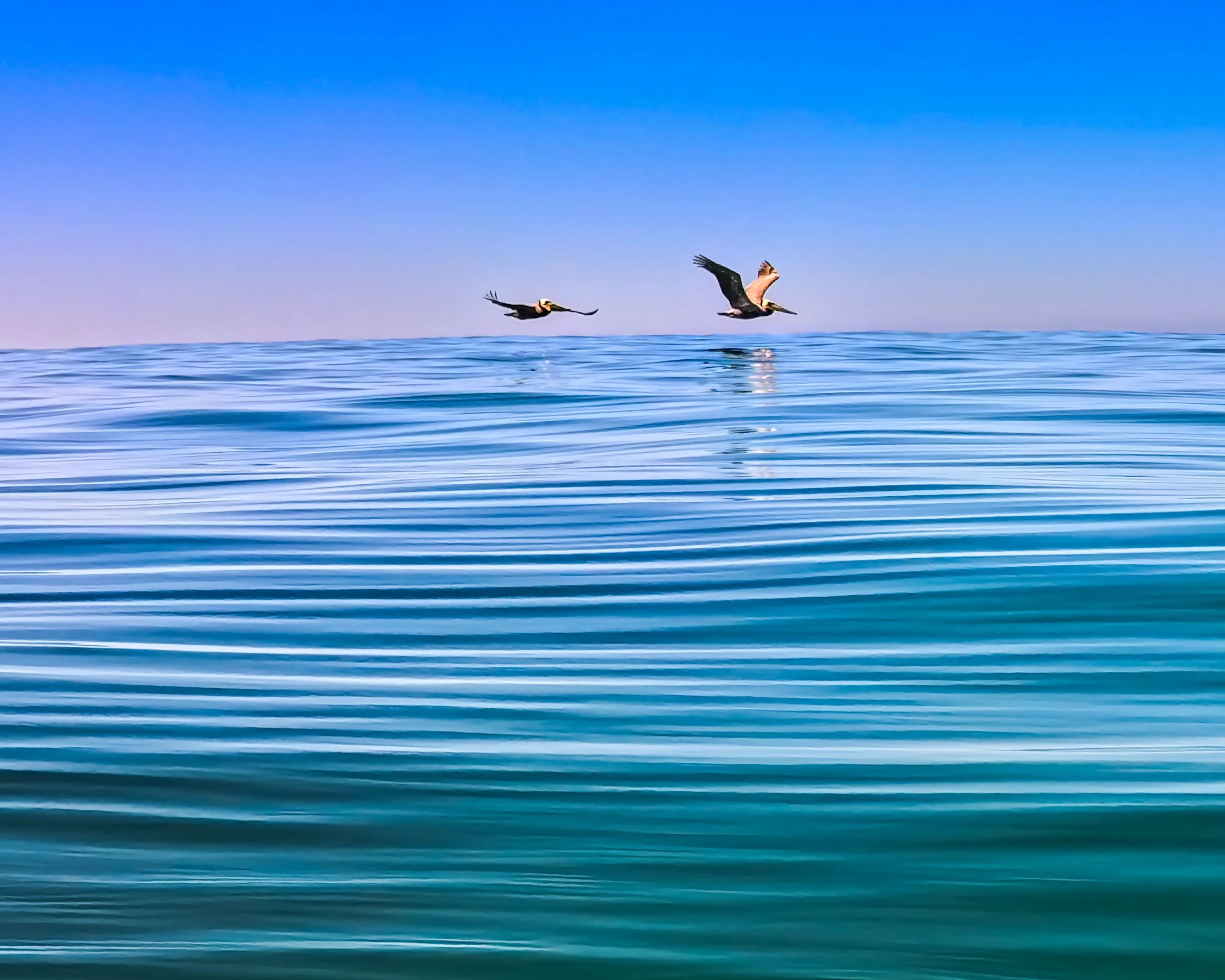 I cross back into Strands Beach territory. Then suddenly it is Pelican Party Central. There are so many of them. I pause to take some pictures and don’t want to resume swimming because they keep appearing. Finally I get to just in front of my finishing spot and I swim into the surf and there are pelicans gliding over and under the crests of the waves. I’m on the back side of a breaking wave and a pelican flies over the curling lip and directly over me tilted upward and the sun catches its under belly and I can’t help but tell him how beautiful he is because he is and it would be a shame if no one said so.