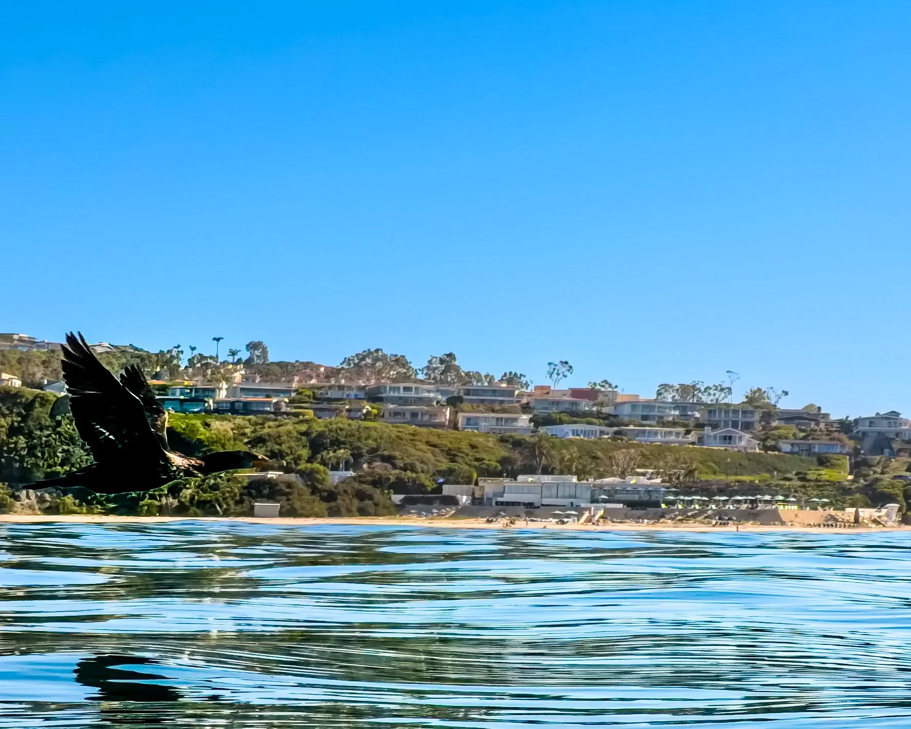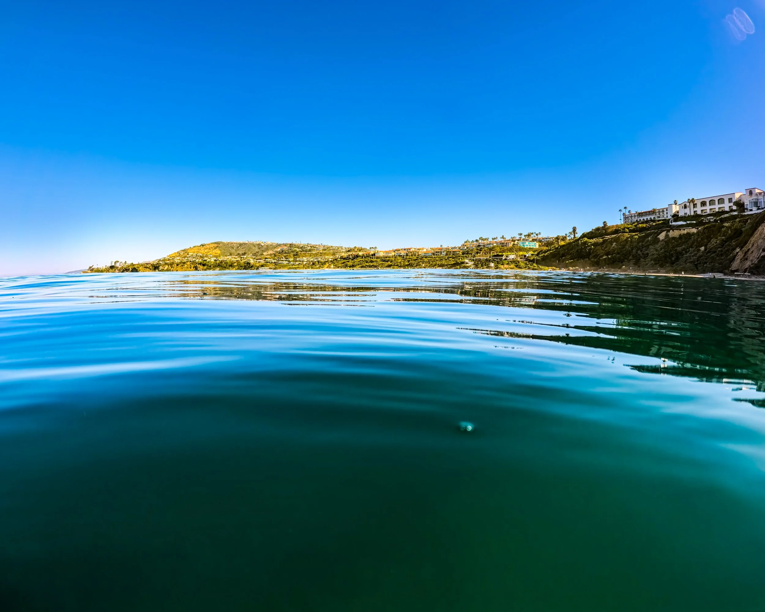 I’m close to the Monarch Bay Beach Club, which is my destination. I continue to swim and occasionally look shoreside, which is not my breathing side, to gauge my progress. Once I am just about in front of the building, I stop for one last look before turning back around.