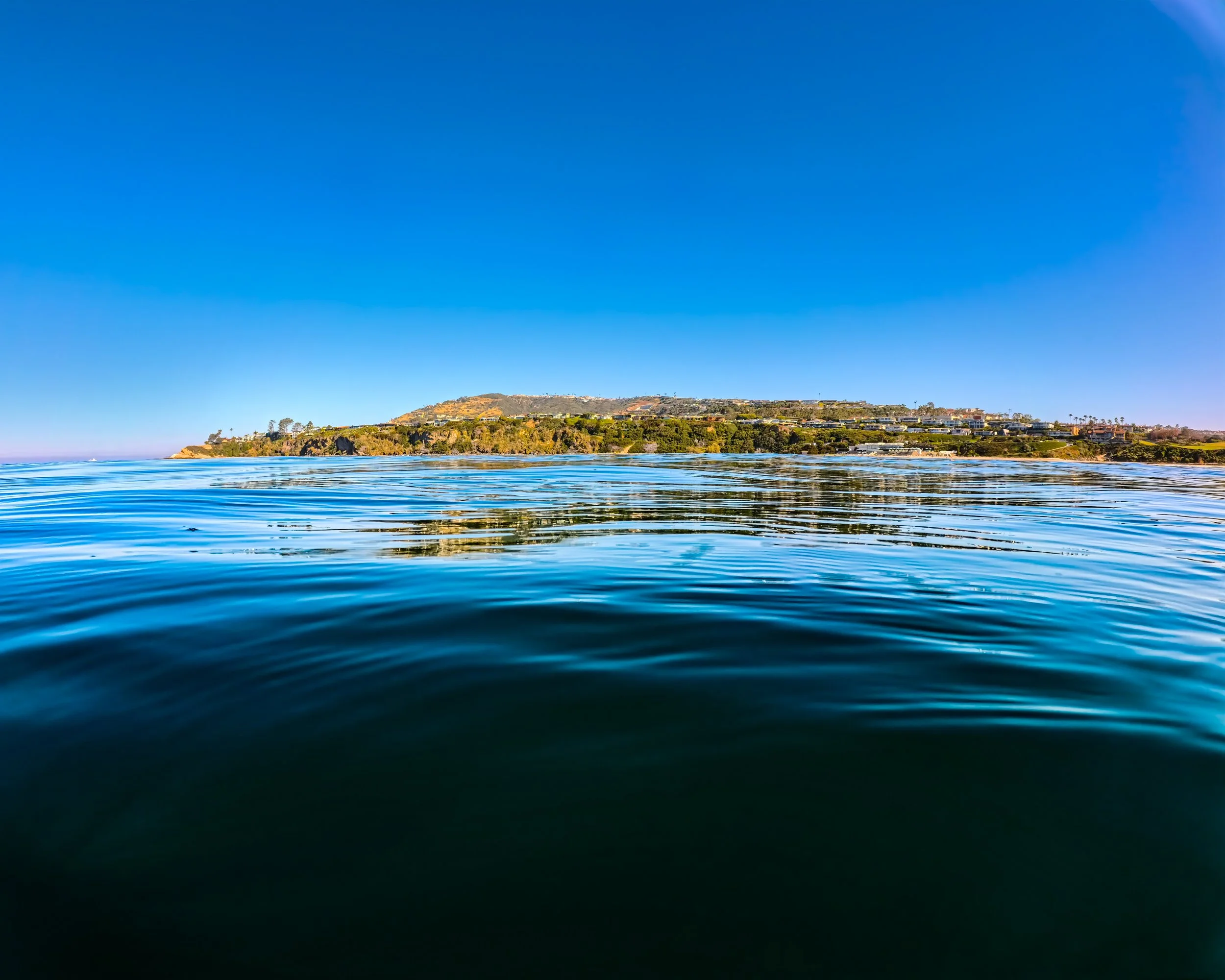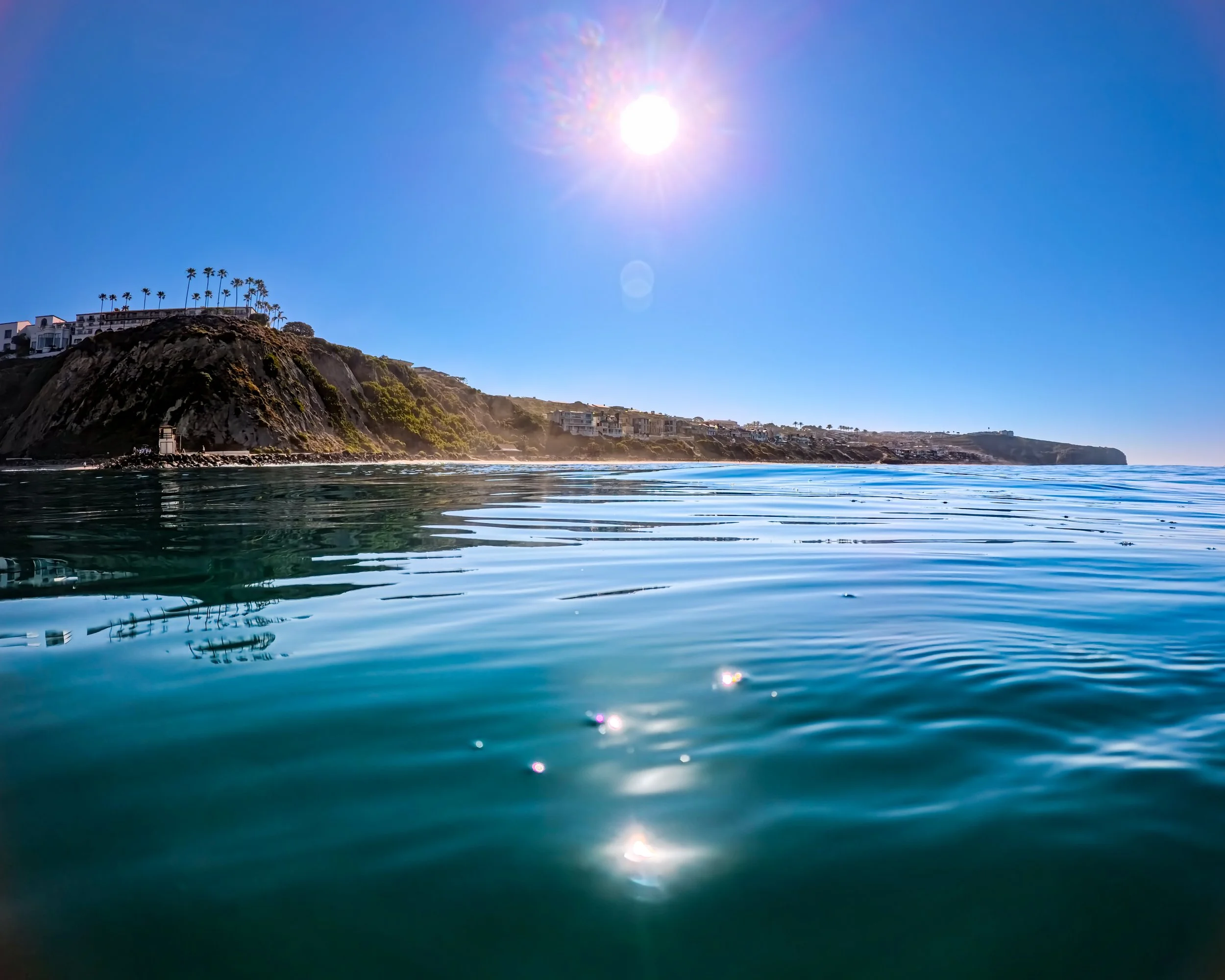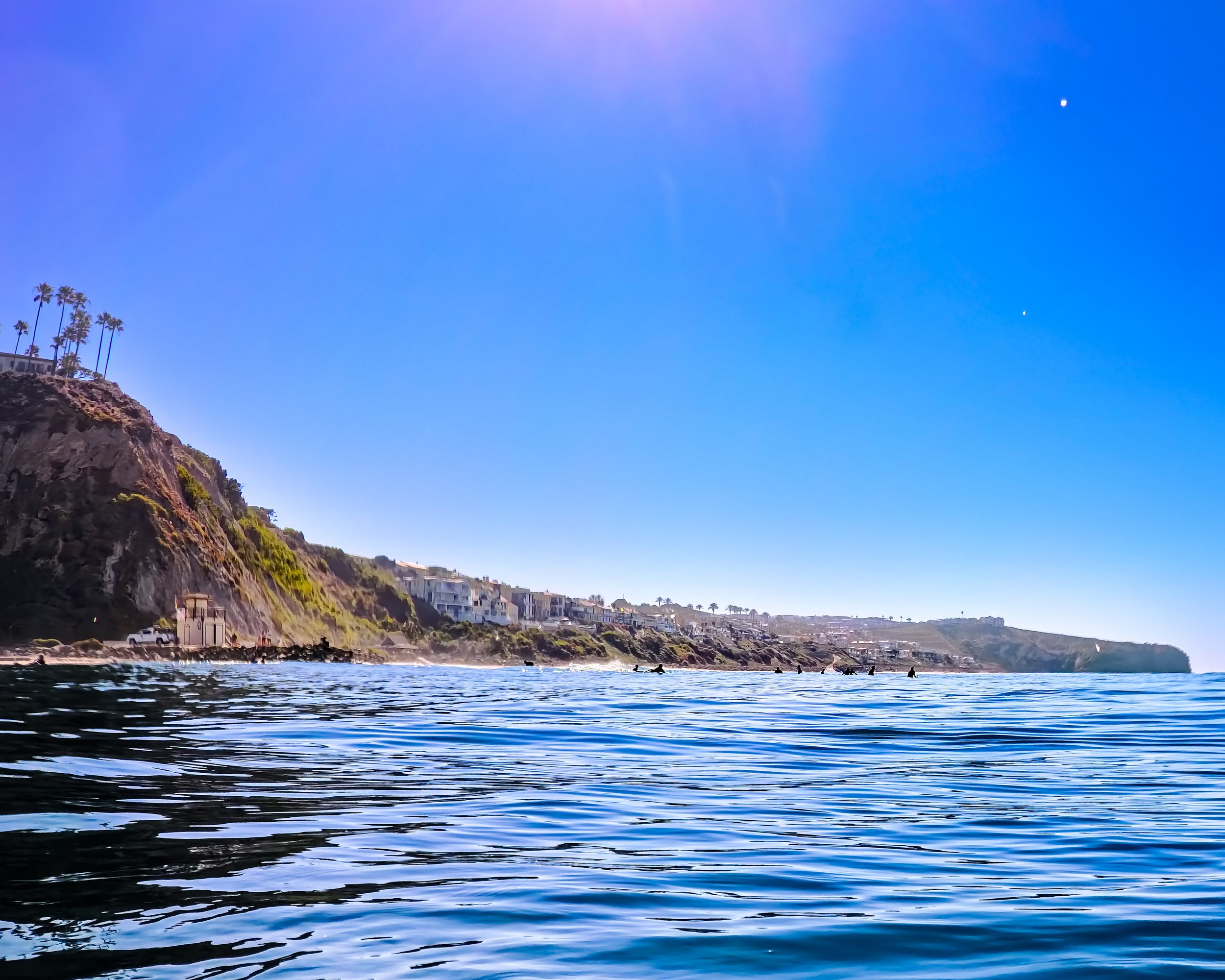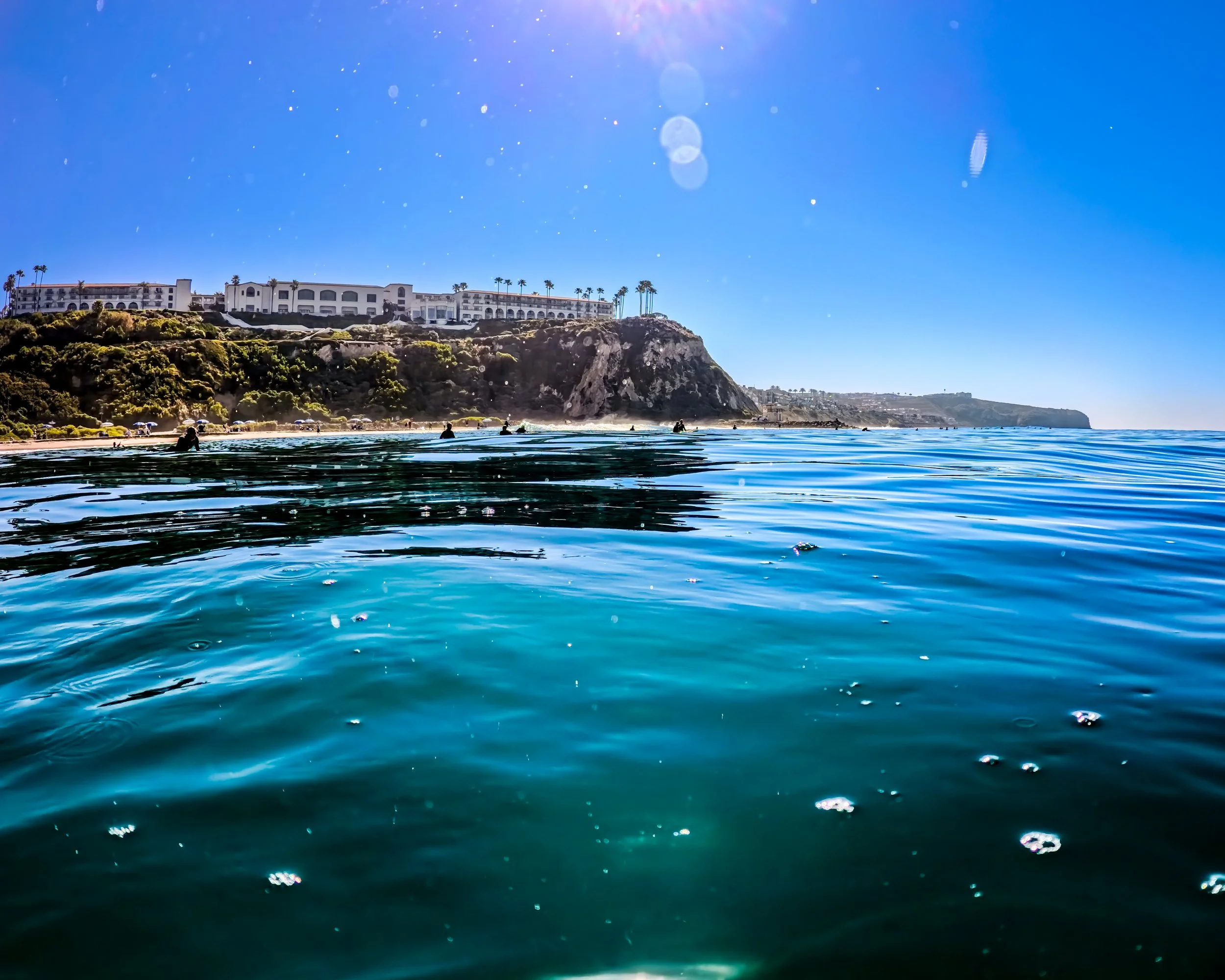 I turn around and swim back in the direction of where I started. It definitely feels like the water is warmer on this second half of the swim. It’s hard to fathom how nice this all is. I stare at the golf course and then the lawn above Salt Creek and then the snack area and then the big buildings of the Ritz. I’m swimming closer to shore than I was on the way north. The surfers are close and I can hear their banter. They sound in good spirits and why shouldn’t they be?
