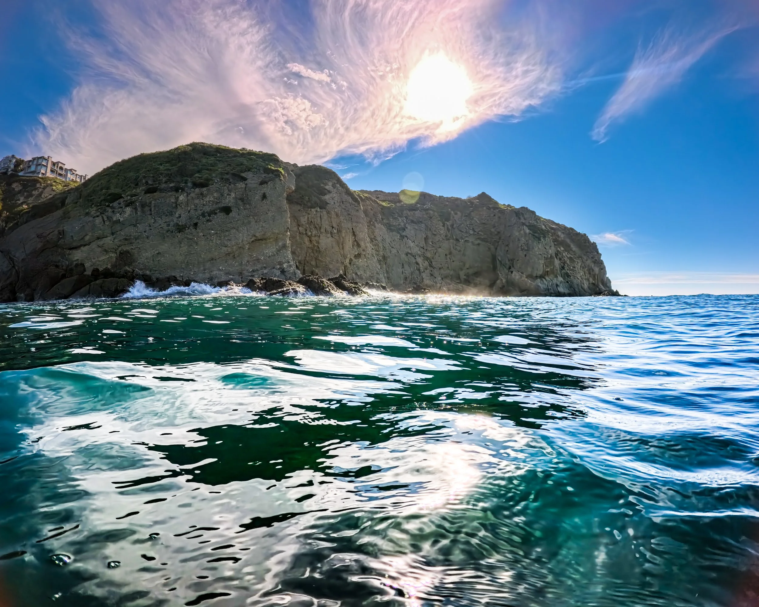 I get in the water and it’s so clear here in the shallows. It’s pretty clear further out as well. Due to the high tide, it does not take long before I am chest deep. I begin to swim south. The water temperature is very similar to yesterday. It might be the same but it is definitely not warmer. Still, I’m not complaining…ok maybe just a little…but I feel good and am super happy to be here.