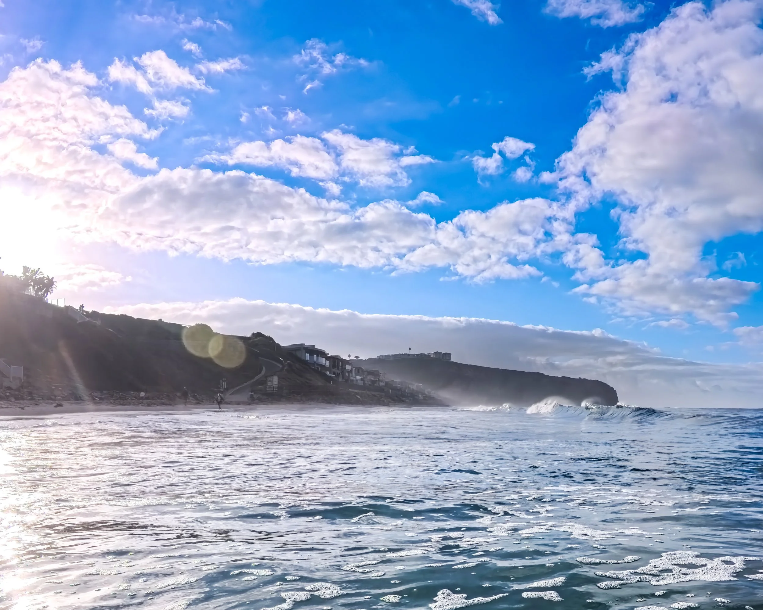 I’m swimming south and I watch the beach as I breath to my left. All the houses look like black silhouettes in front of the sun just above. The water below the surface is dark and murky. I don’t see any fish today and what kelp I do see seems hidden in shadow. Once I reach the south end of the beach, the cliffs of the headlands are black and I trace the edges with my eyes and I find the familiar rock outline as it meets the water. Turning around to face the north towards Laguna, everything looks bright and vibrant. The blue of the water looks extra blue, the golden sand on the beach glows and the hills and houses seem like someone has bumped up the clarity setting. It’s all so beautiful and it feels like the beauty is enhanced by the solitary vastness of the water I inhabit.