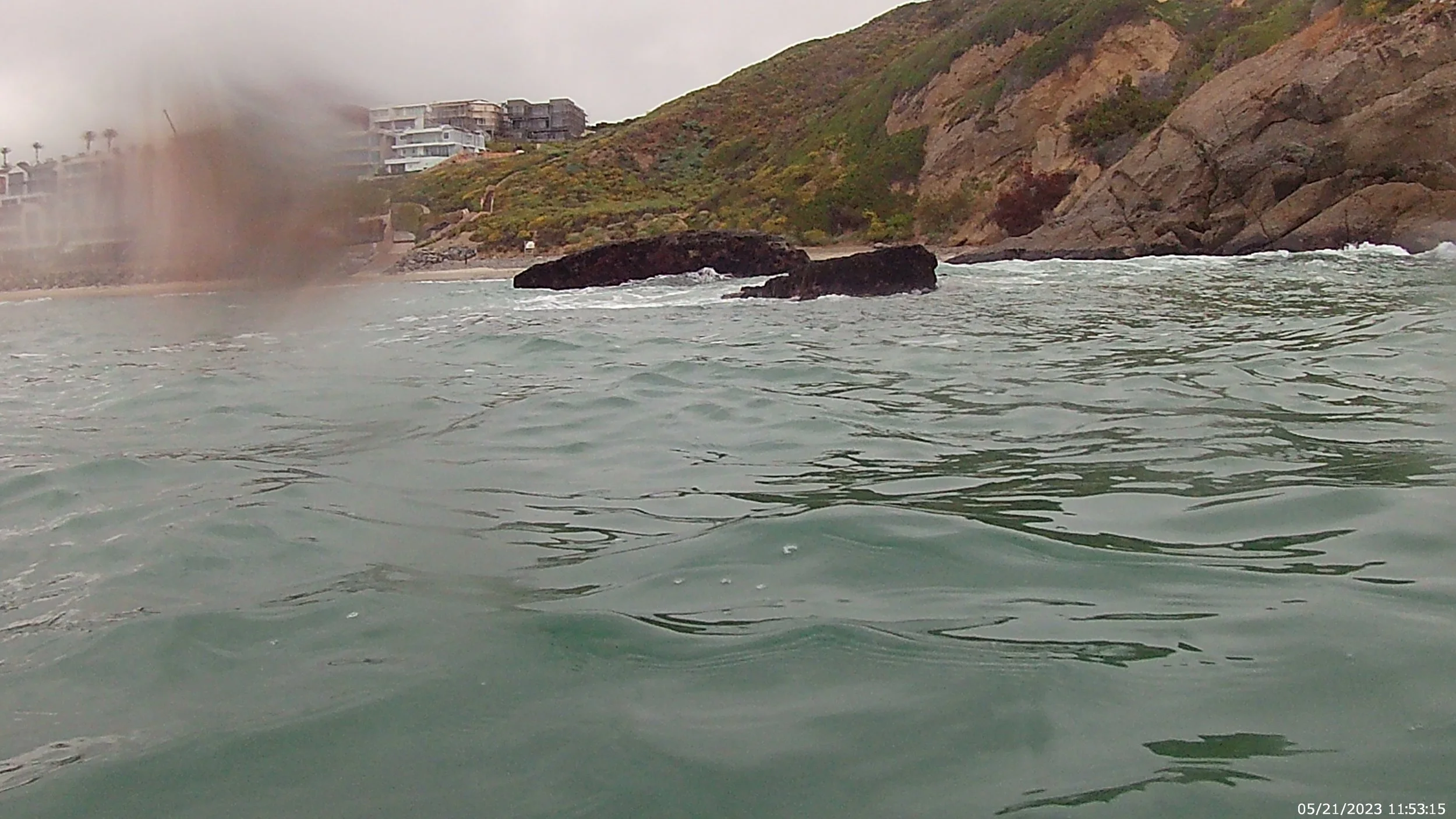 As I descend the asphalt ramp, I see three other swimmers standing in the shallows. It looks like they are tip toeing through rocks. I’m not sure if they are coming or going but soon see them swimming off into the northern distance towards Salt Creek. It seems like all the other swimmers I see here start their swims in the water at the base of the ramp. While that is certainly the most direct route to the water, it is riddled with rocks all year round and I prefer to start a couple hundred feet north where there are no rocks except for this last February/March. The exception is super high tide when the beach is unpassable. Then I go ahead and start at the base of the ramp because I’ll just swim over all of those rocks anyways.